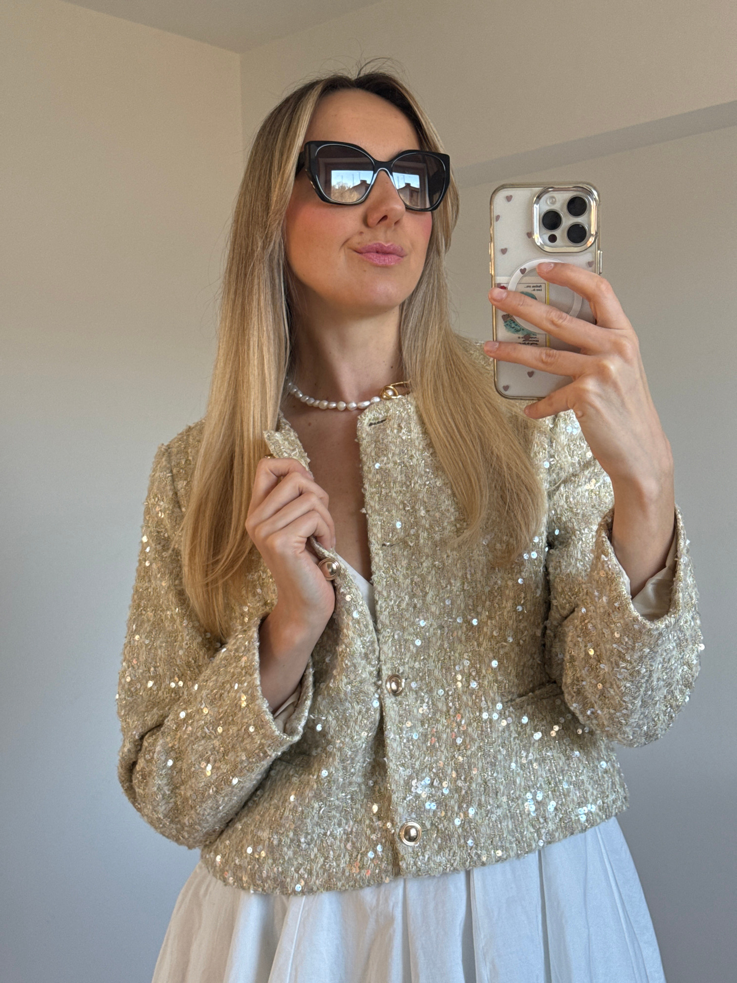 A woman with long blonde hair, sunglasses, and a pearl necklace takes a selfie with her iPhone. She's wearing a sequined jacket over a white garment. The background appears to be a plain wall. The loc…read more