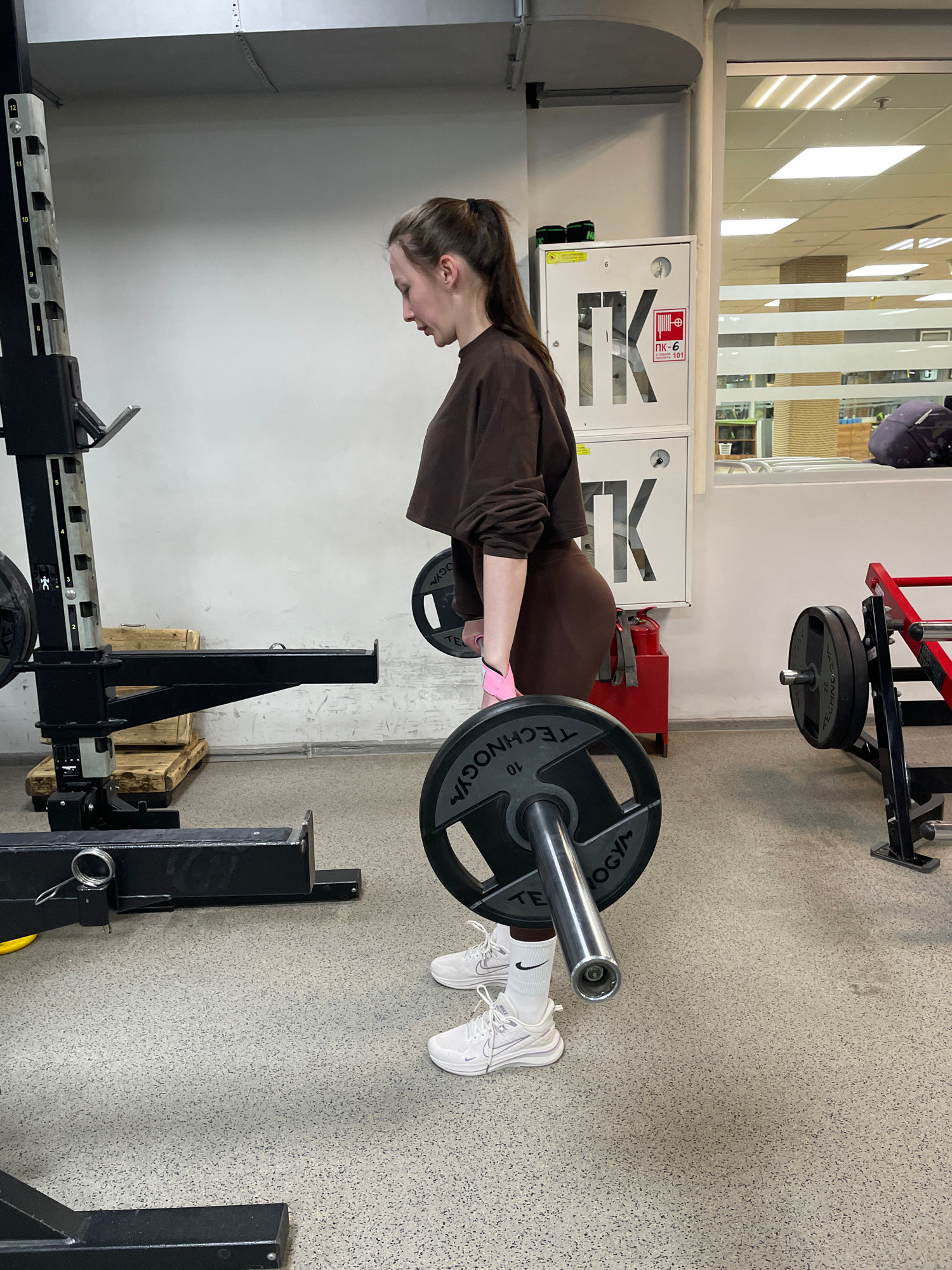 The image depicts a woman performing a bent-over row exercise in a gym setting. She is wearing a brown sweatshirt, brown leggings, white socks, and white sneakers. She is bent over, holding a barbell…read more