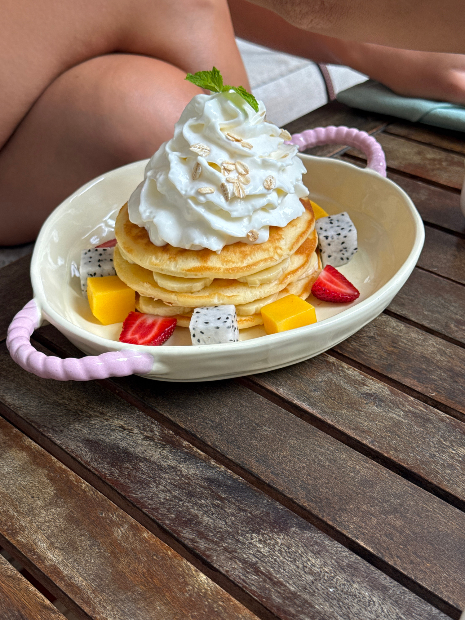 The image shows a plate of pancakes with whipped cream and fruit on a wooden table. The fruit includes strawberries, mango, and dragon fruit. The pancakes are topped with oats and a mint sprig. The pl…read more