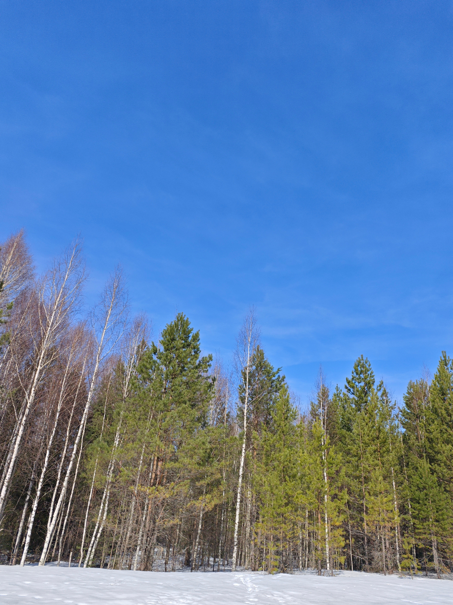 The image shows a forest scene in what appears to be a snowy field. The trees are a mix of birch trees with white bark and coniferous trees, likely pine or spruce. The ground is covered in snow, with…read more