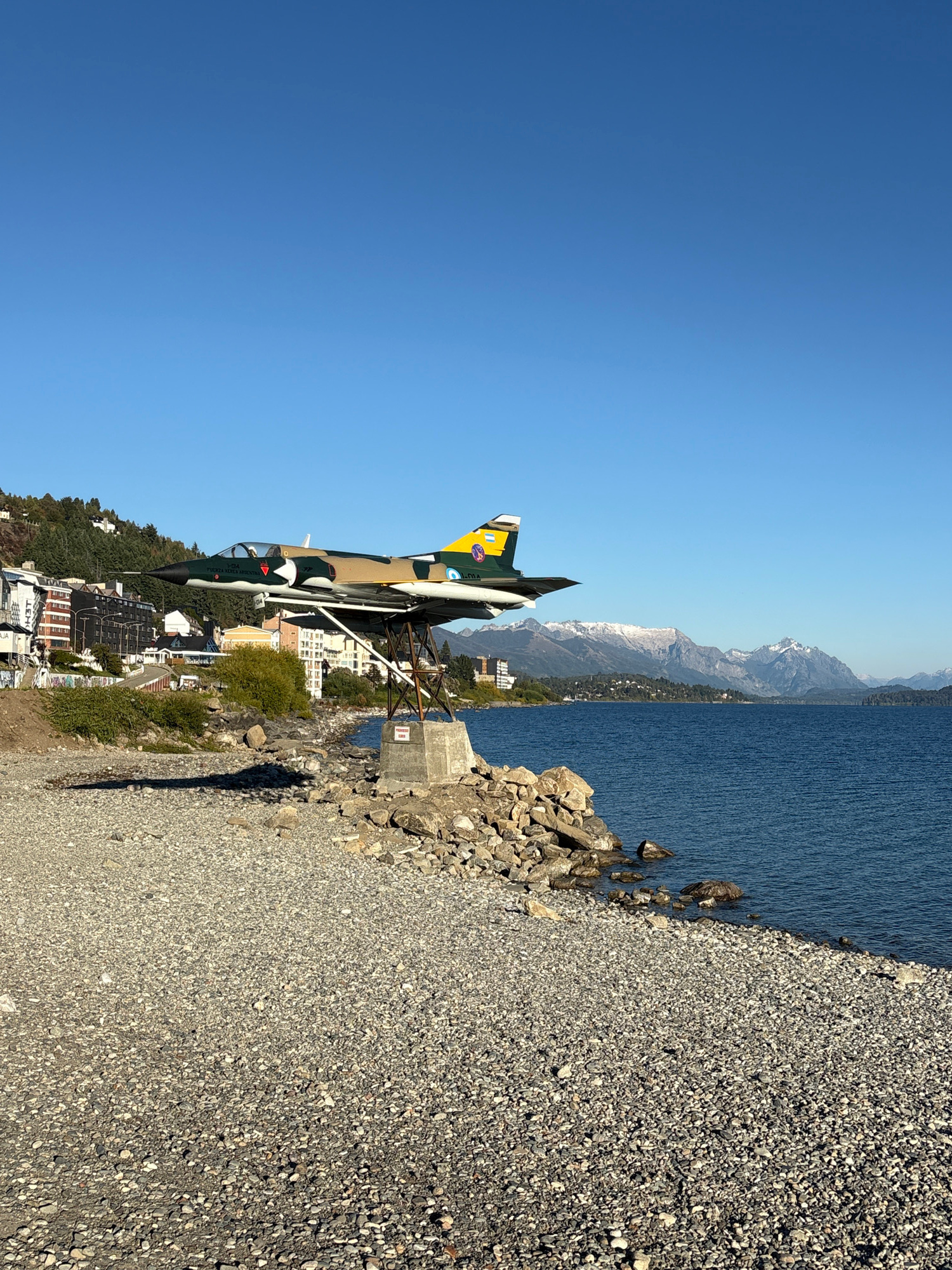 The image captures a static scene on the pebble shoreline of Lake Nahuel Huapi in San Carlos de Bariloche, Argentina, under a clear blue sky. A camouflaged Dassault Mirage III/V fighter jet, featuring…read more