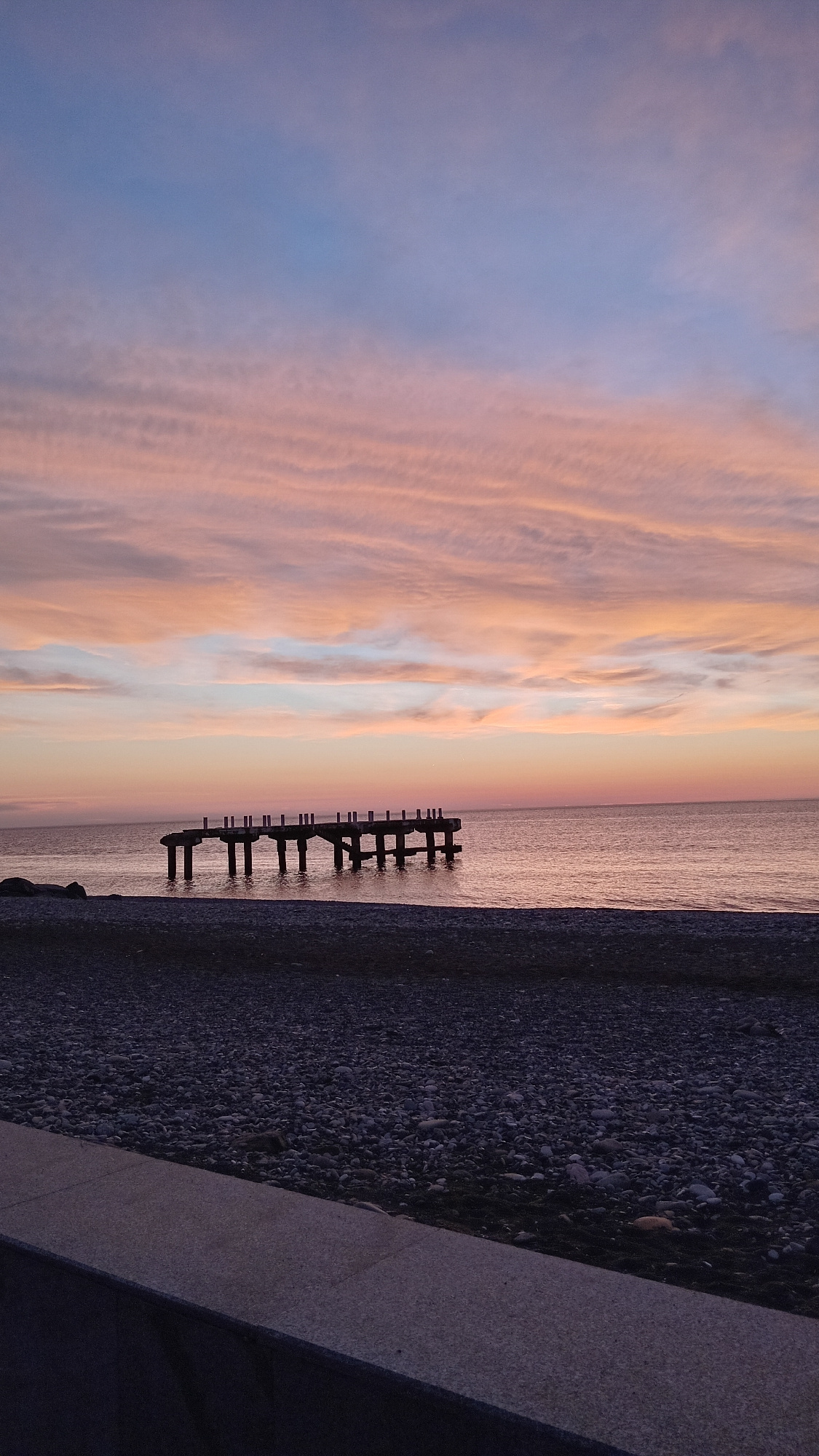 The image depicts a sunset at Batumi Beach in Batumi, Georgia. The sky displays hues of orange, pink, and blue. A calm sea reflects the colors of the sunset. A portion of a dark, rocky beach is visibl…read more