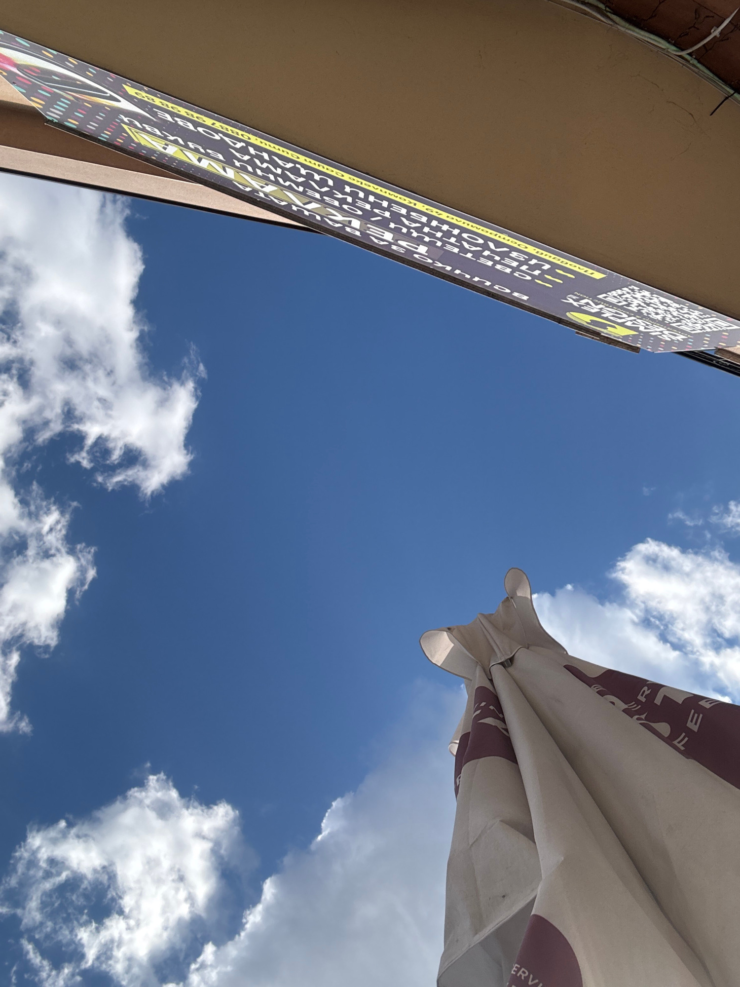The image shows a low-angle view of the sky in Plovdiv, Bulgaria, partially obscured by clouds and two architectural elements. A tan building with a vertical sign is visible on the left, and a white u…read more