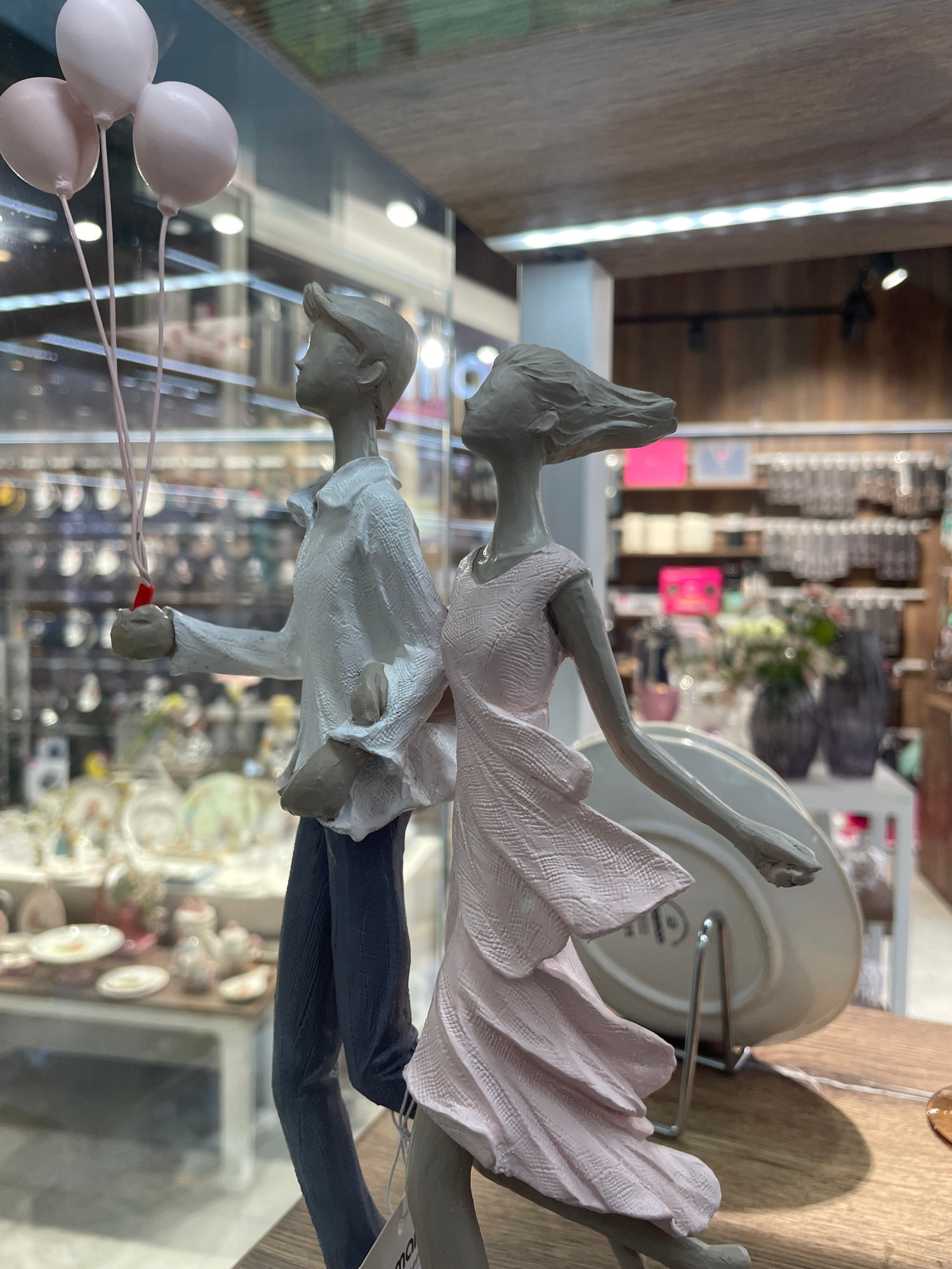 The image shows a ceramic figurine of a couple in love. The man is wearing a white shirt and dark pants and holding three light pink balloons. The woman is wearing a pink dress and has her arm raised.…read more