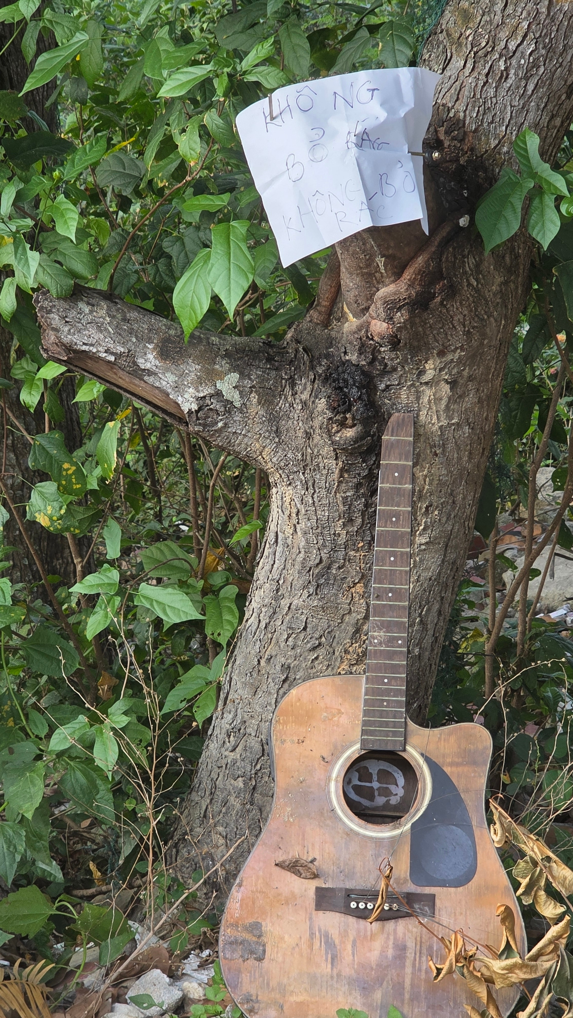 The image depicts a damaged acoustic guitar resting on a fallen tree branch within a verdant, overgrown area. A piece of paper is attached to the tree near the branch. The guitar is missing strings an…read more