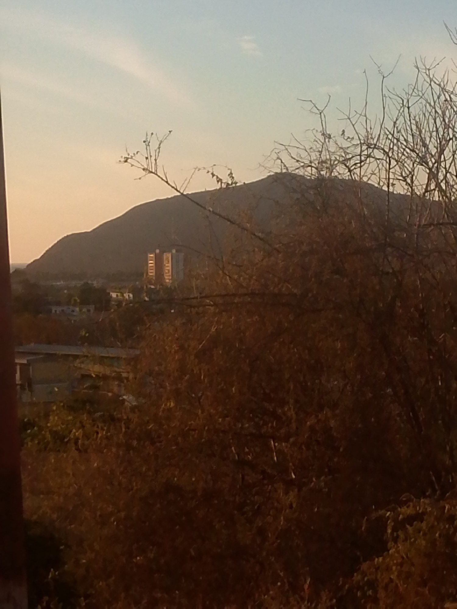 The image shows a landscape in Altagracia, Venezuela, at dusk or dawn. In the background, there's a hill or mountain. In front of the hill, there's a building, presumably a residential or commercial c…read more
