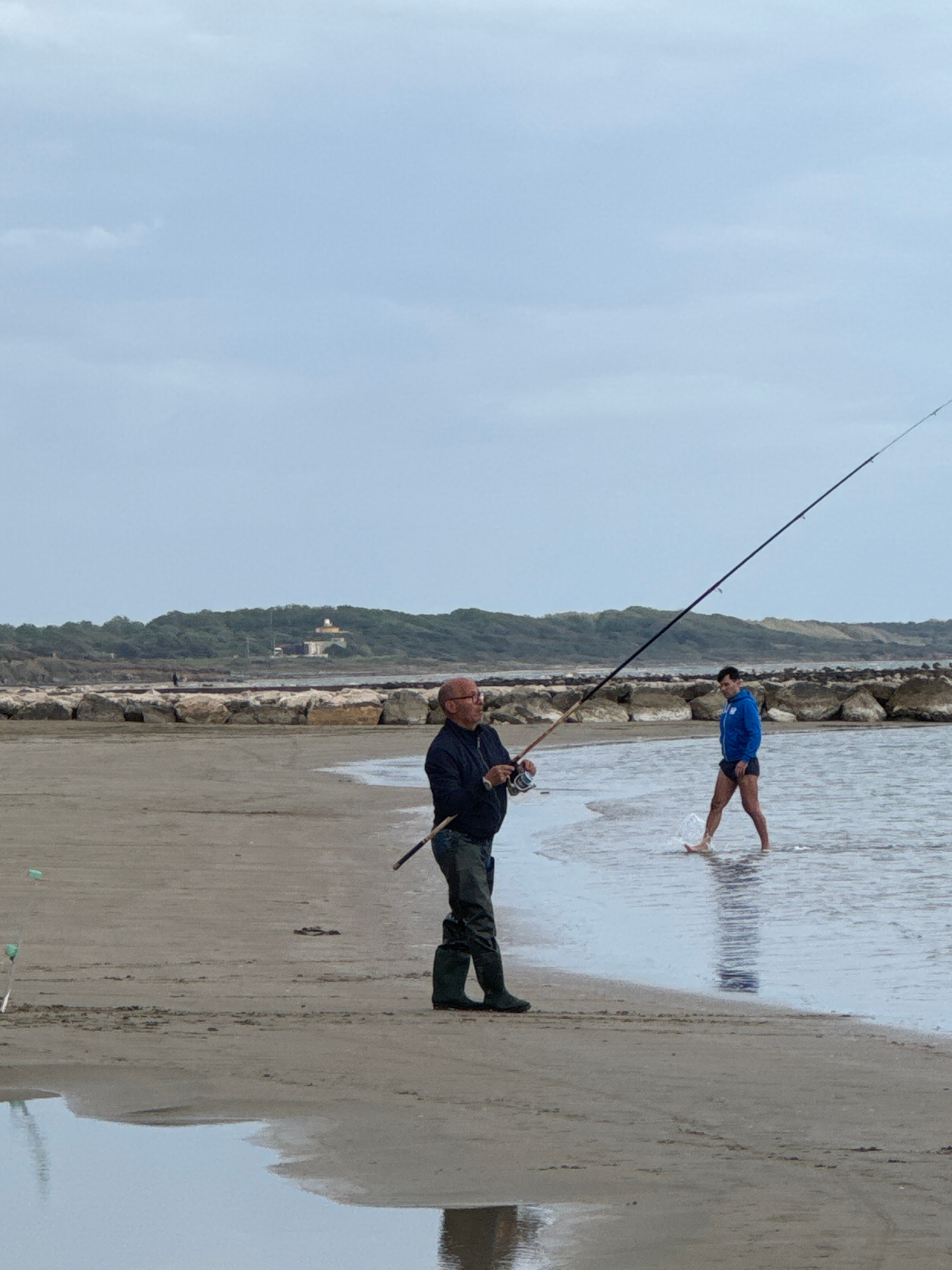 This image captures a daytime scene on a coastal beach, likely in Nettuno, Italy, featuring two men. The original image is rotated 90 degrees counter-clockwise. In the foreground, an older man stands…read more