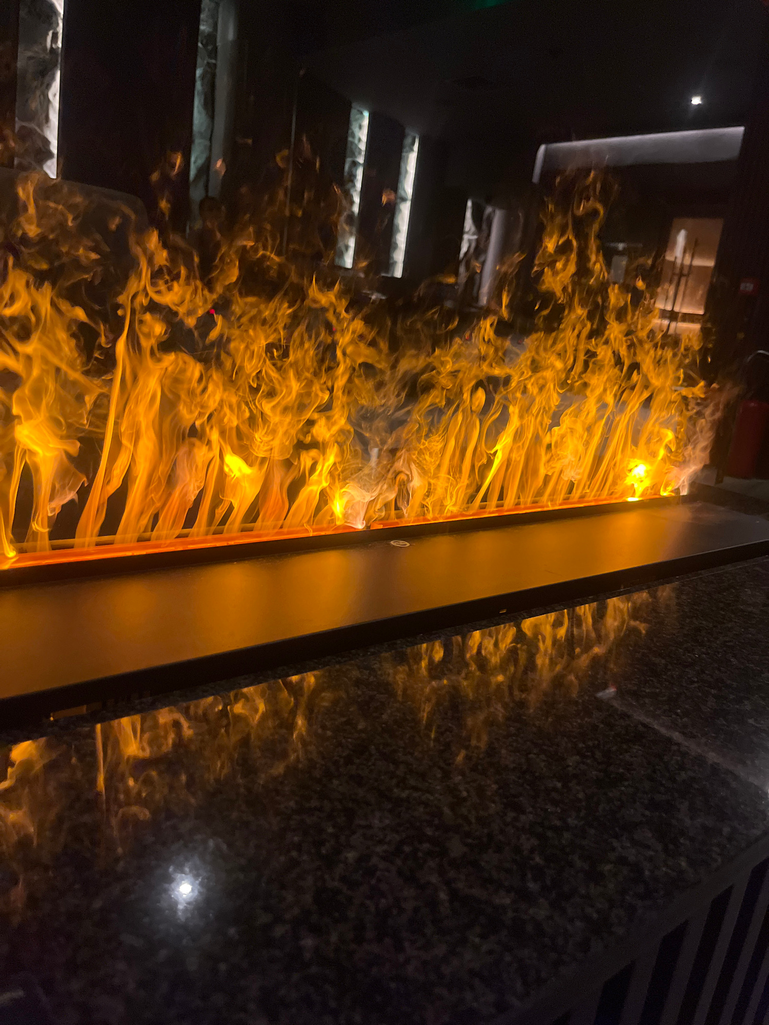 The image shows a decorative artificial fire installation within an interior space. The "flames" are illuminated in shades of orange and yellow. The installation appears to be encased in a vertical st…read more