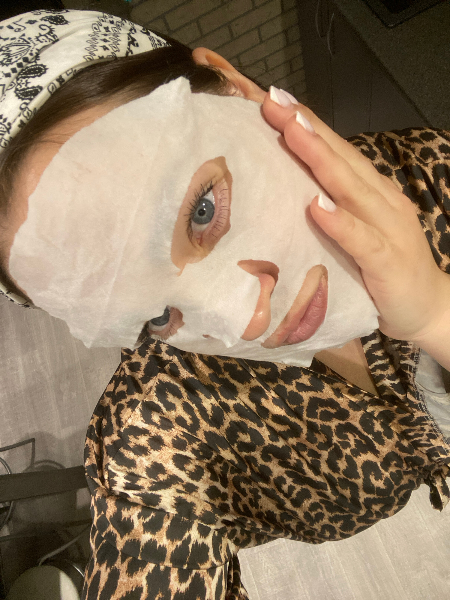 A woman is applying a sheet mask to her face. She is wearing a leopard print robe. Her right hand is on her forehead. She is wearing a patterned hair wrap. The background includes a gray wall and hint…read more