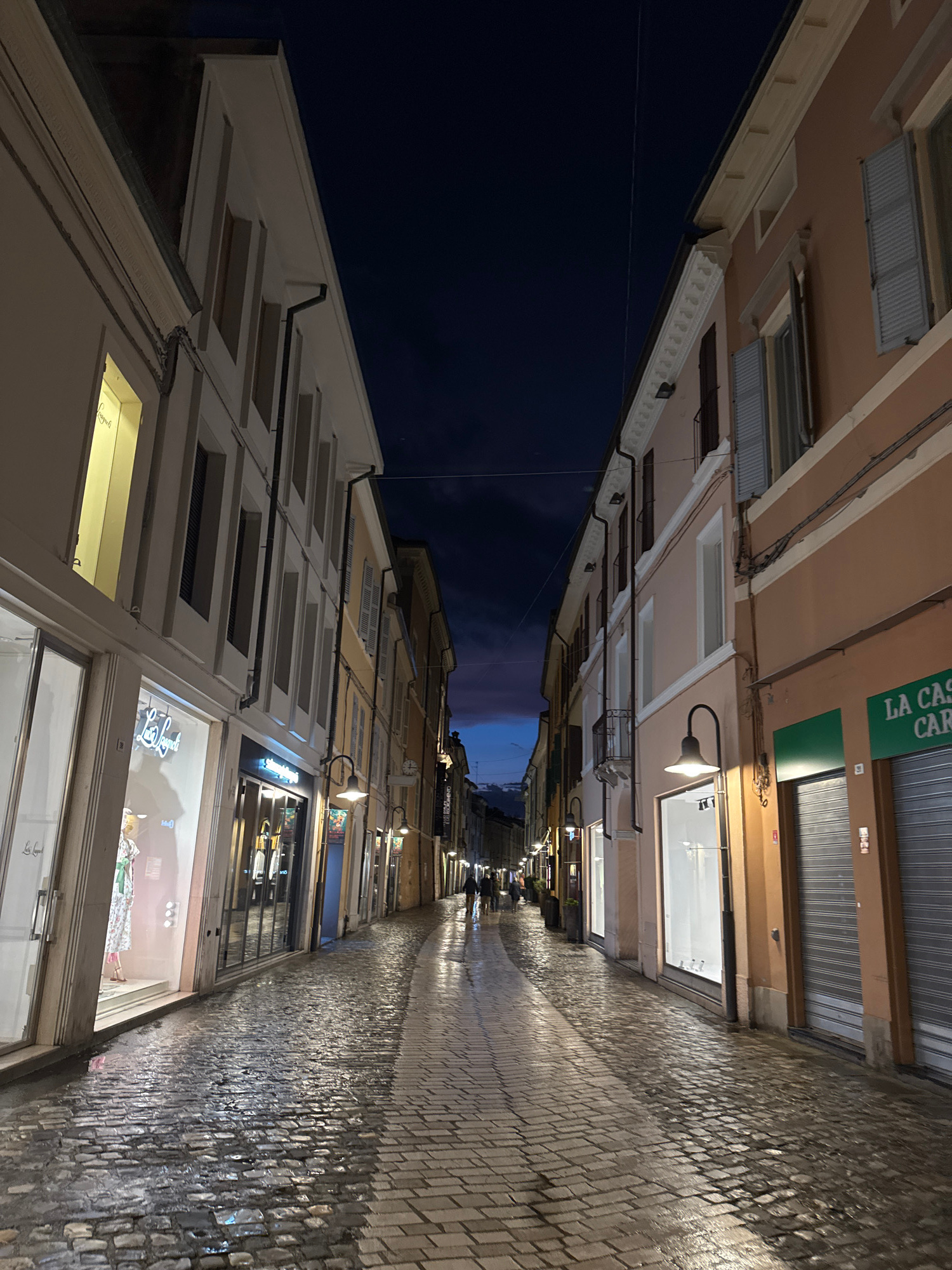This low-angle, medium shot depicts a narrow, rain-slicked alleyway in Ravenna, Italy at night. The camera points down the alley, creating a vanishing point in the distance. The cobblestone street ref…read more