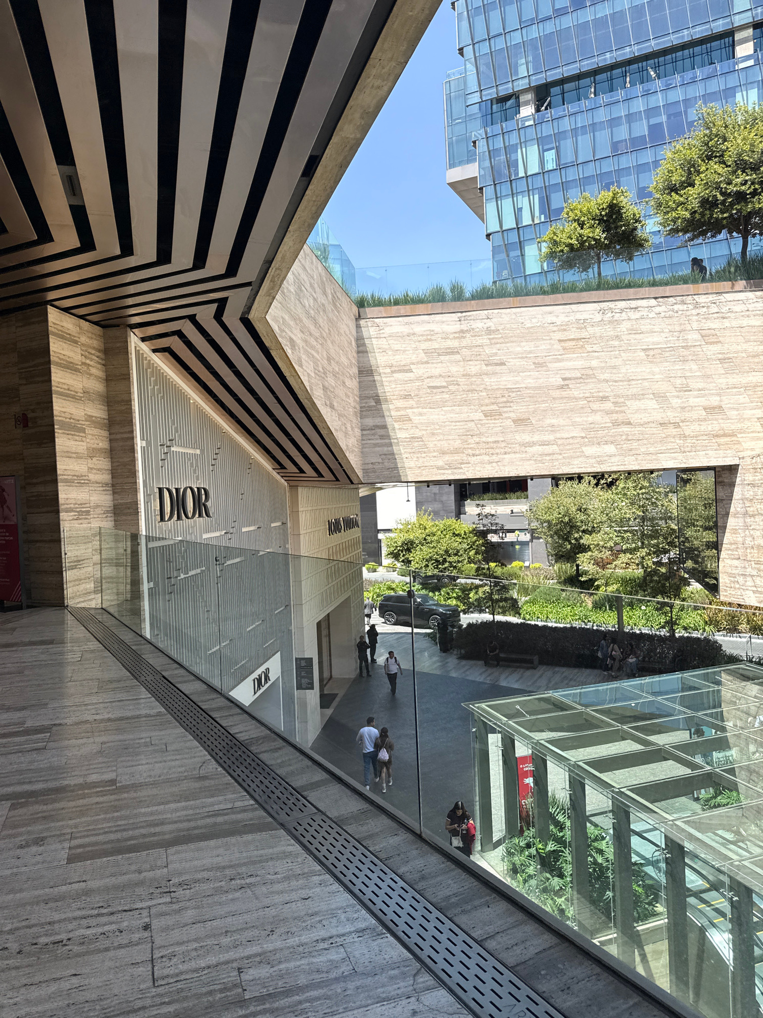 An eye-level shot is taken in Mexico City, Mexico, in an outdoor upscale shopping area, with Dior and Louis Vuitton stores visible. The view is from a slightly elevated position looking down at the sc…read more