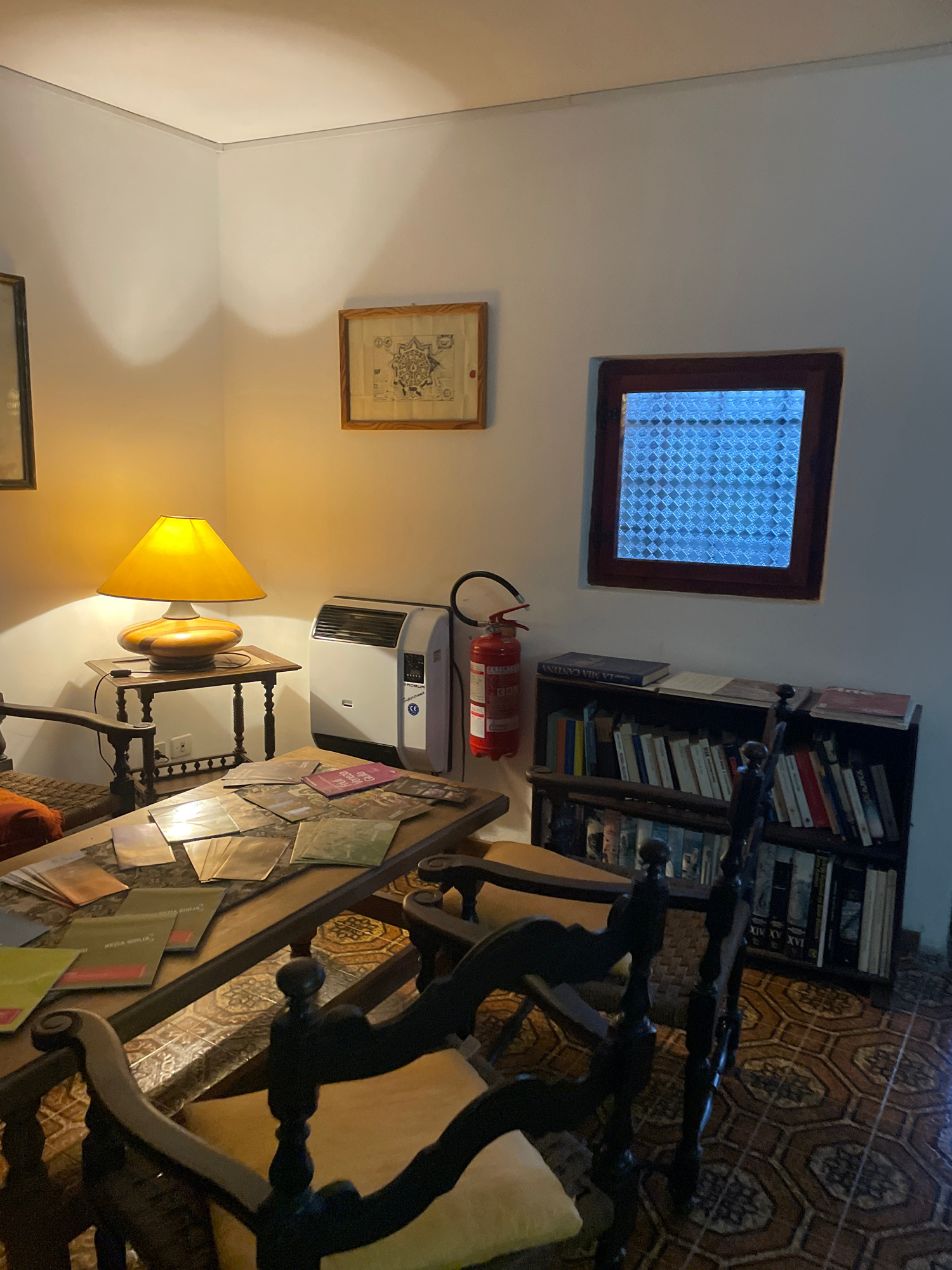 A room interior shot in San Lorenzo, Italy, features a window with a patterned screen, a bookcase filled with books, a table with a lamp, and chairs. A framed map hangs on the wall above the lamp, and…read more