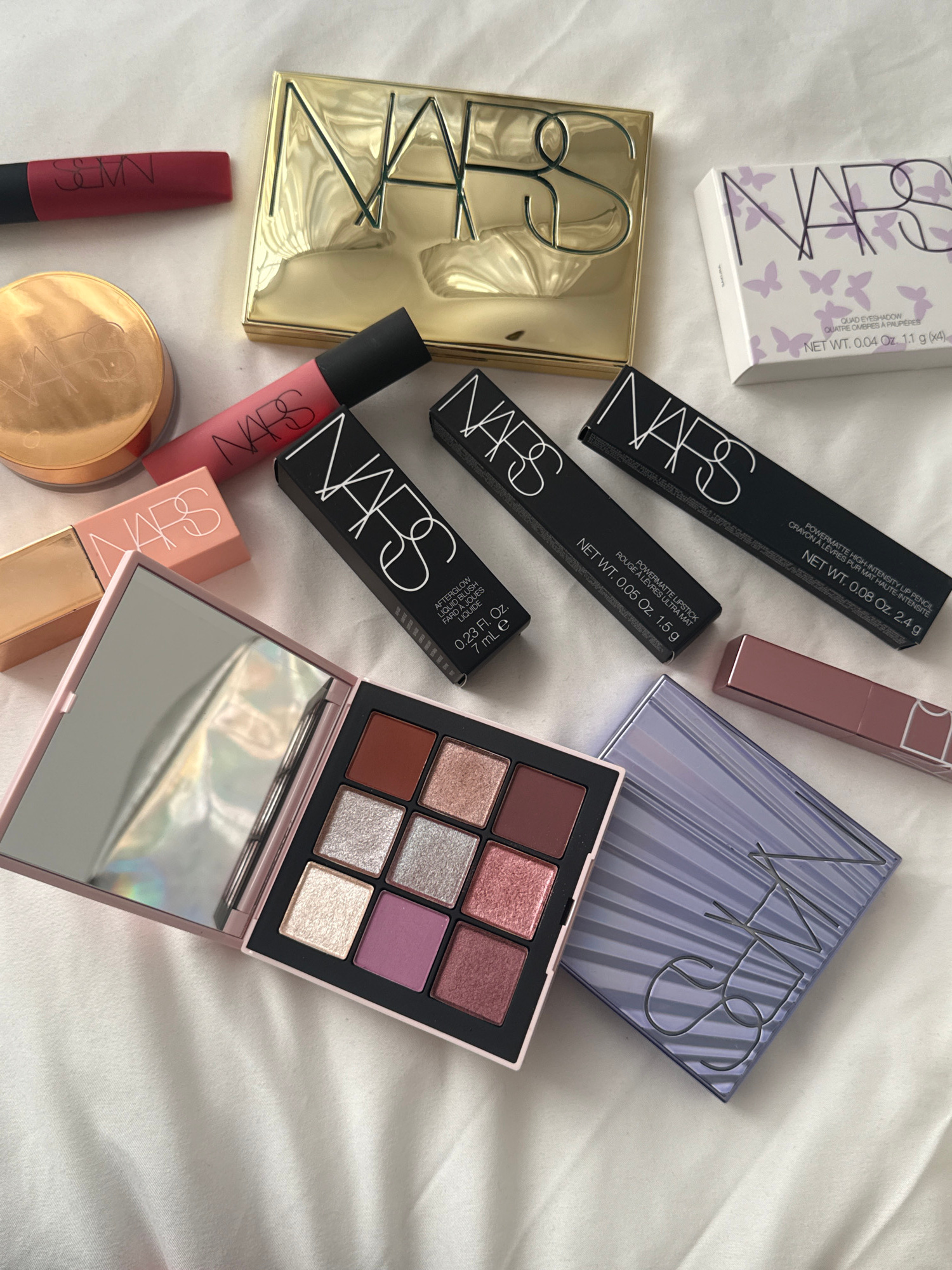 The image shows a collection of NARS brand cosmetic products arranged on a white surface. The products include several lipsticks in various shades and packaging, a liquid blush, multiple eyeshadow pal…read more