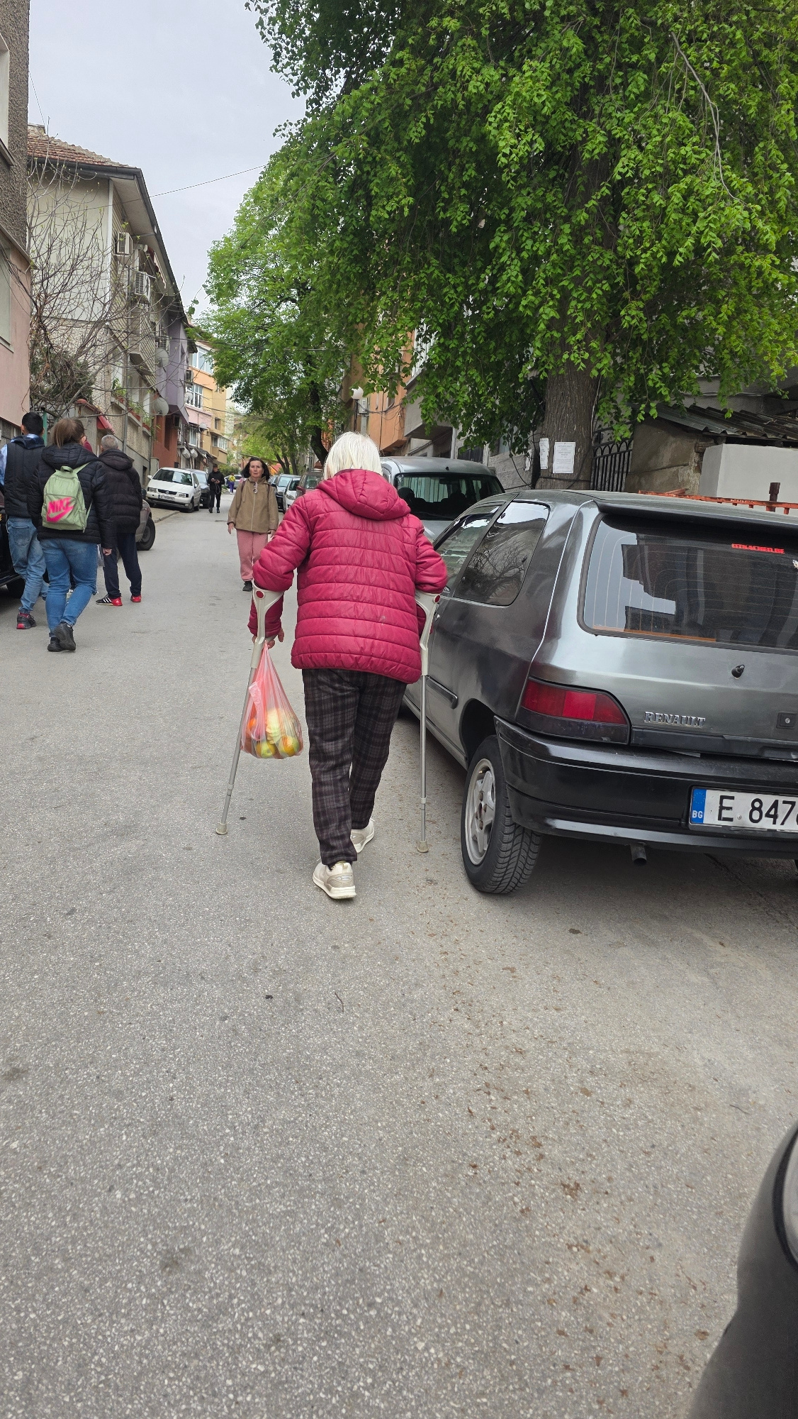 This daytime image depicts a street scene in Blagoevgrad, Bulgaria, under an overcast sky. The overall impression is of an ordinary day in an urban environment, likely in spring or summer given the full, green leaves on the trees. In the foreground, an elderly person, possibly a woman with light-colored hair, is walking away from the viewer. She is wearing a red padded jacket, patterned (plaid) trousers, and light-colored sneakers. She uses two silver crutches for support and carries a transparent plastic bag containing yellow fruit, possibly apples or lemons, in her left hand. Immediately to her right, a dark grey Renault Clio car is parked. Its rear shows the license plate "E 8470 BG," indicating Bulgaria, and the brand name "RENAULT" is visible on the tailgate. The street surface is asphalt, with some discolored patches. To the left of the scene, a large tree with abundant green foliage fills a significant portion of the frame. In the background, further down the street, several other people are visible. One woman wearing a tan coat is looking towards the camera, while a small group of individuals, including one person with a bright green backpack, can be seen walking or standing. The street is lined with buildings of varying colors and heights, featuring windows, balconies, and air conditioning units, typical of residential or mixed-use urban architecture. | Open Wire