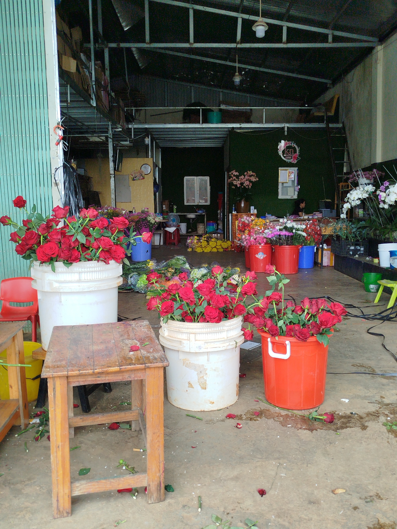 The scene depicts the interior of a flower shop, likely located in Cam Ly - Đà Lạt, Vietnam. The shop is open to the outside, with an overhead shelter revealing exposed metal framework. Several bucket…read more