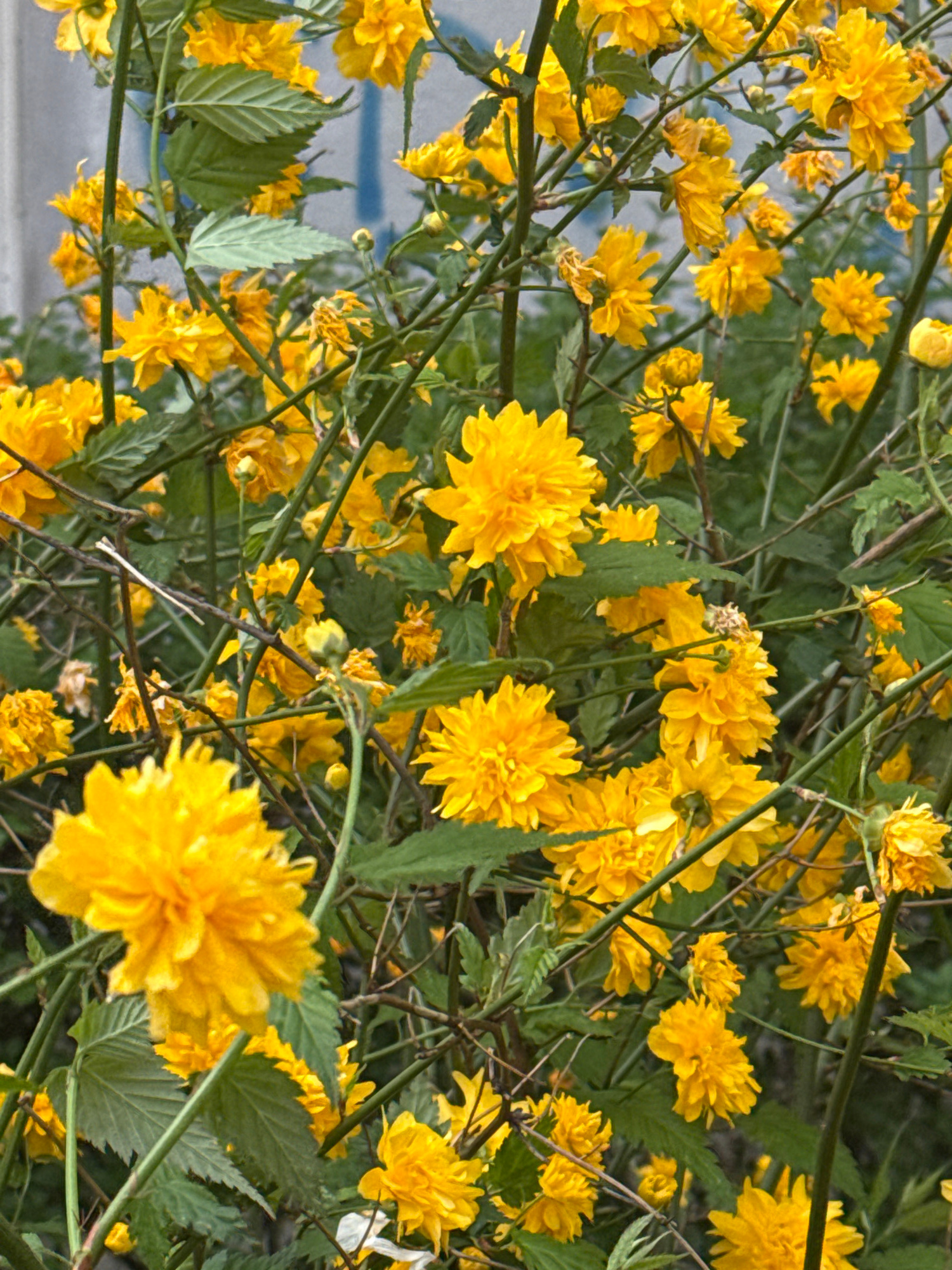 The image shows a dense cluster of yellow flowers and green leaves. The flowers are small and multi-petaled. Thin, brown branches weave through the foliage. In the lower-left corner, a section of a li…read more