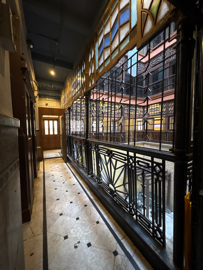 An interior long-shot depicts a historic corridor within a multi-story building in Kolkata, India. The perspective is directed down the length of the corridor, which features a white marble tiled floo…read more