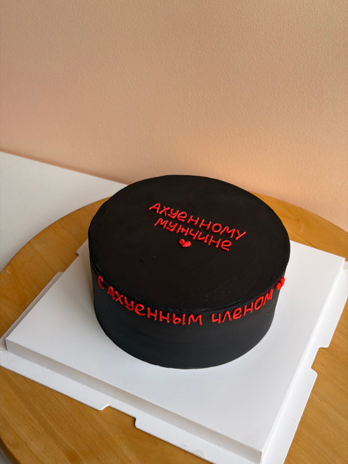 A cylindrical cake, frosted entirely in black, is centered on a white square cardboard cake base. Red icing text adorns the cake: "Ахуенному мужчине" (To an awesome man) is piped across the top, accom…read more