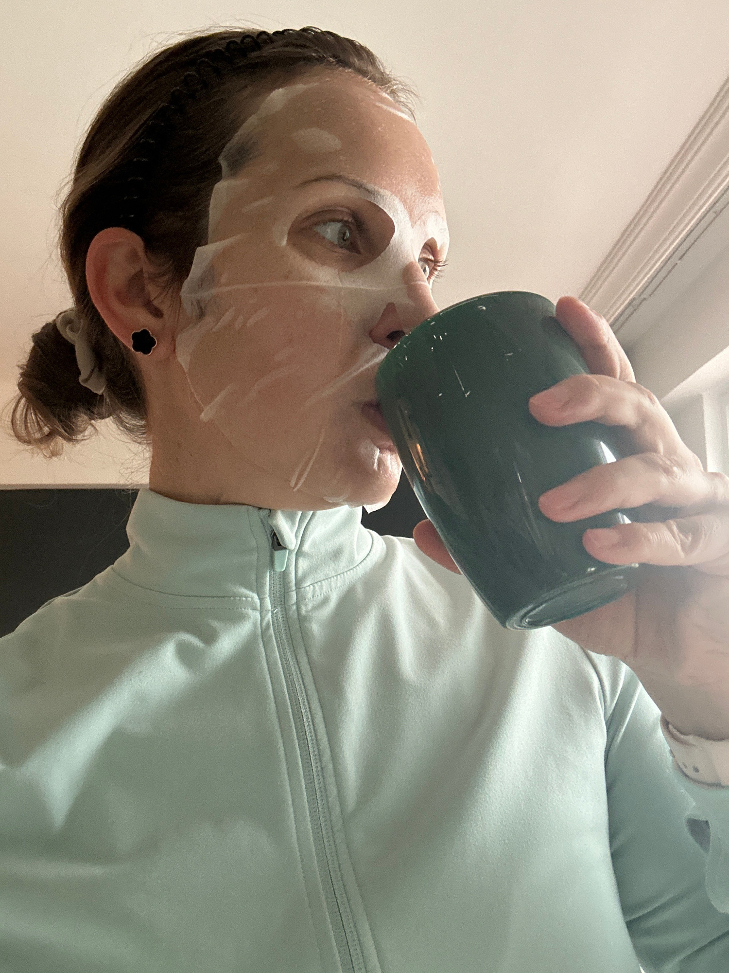 A woman wearing a facial sheet mask is holding a green mug up to her mouth. She is wearing a light blue or green zip-up jacket. Her hair is pulled back and she has flower-shaped earrings. The backgrou…read more
