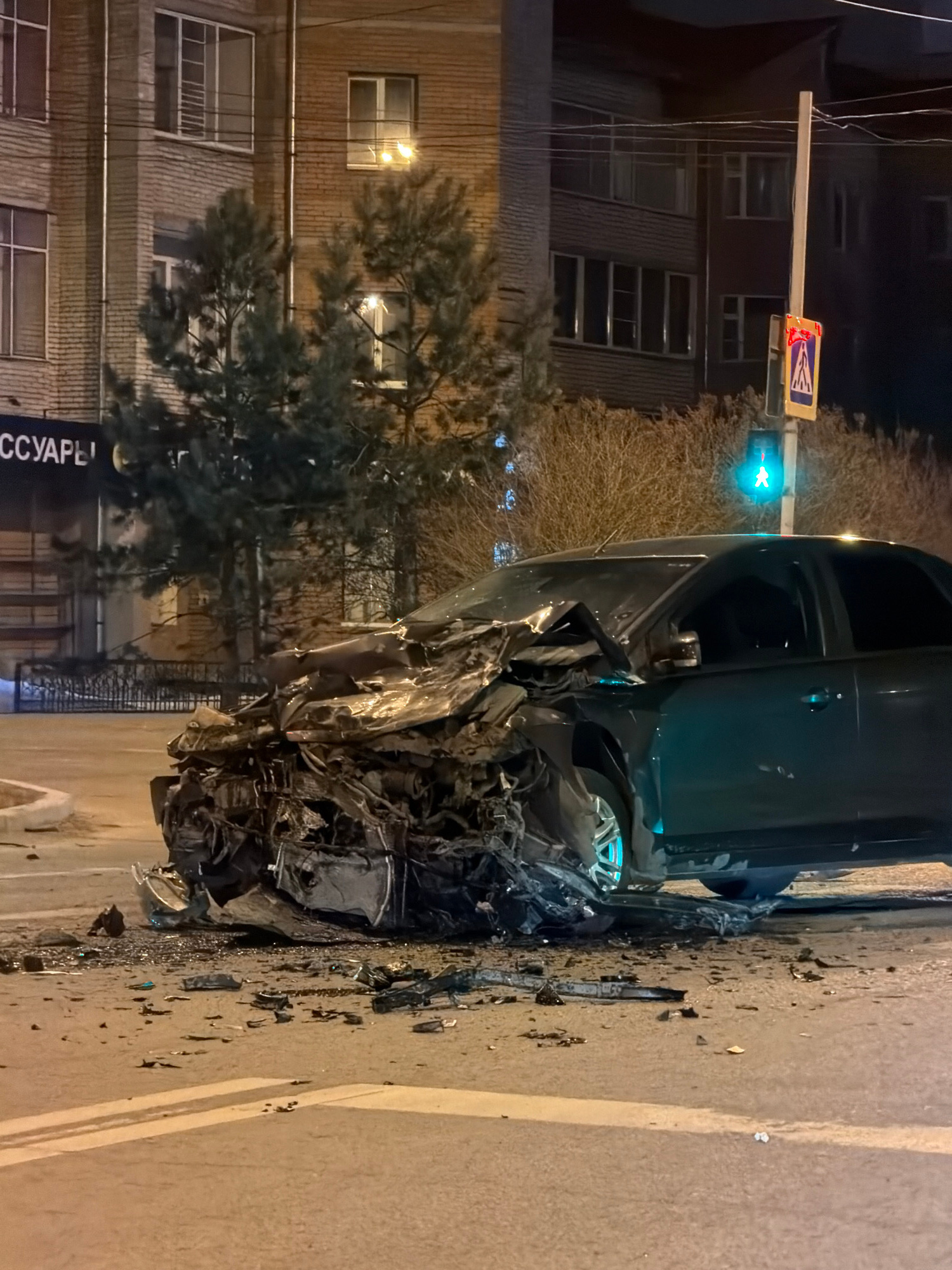 This media file captures the aftermath of a severe car accident at night in Krasnoyarsk, Russia. **Subjects:** The primary subject is a dark-colored vehicle, likely an SUV or large sedan, with its fr…read more
