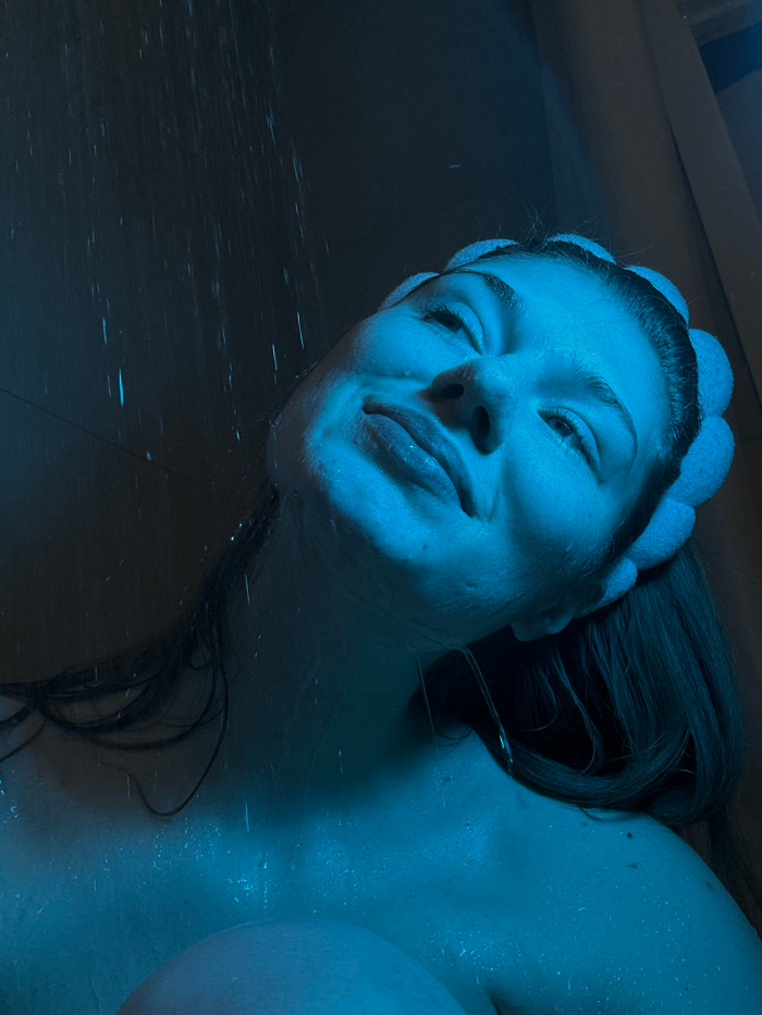 A close-up image depicts a young adult female showering under a blue light. Her head is tilted upwards, eyes partially squinted, and lips slightly parted as water streams down onto her face and upper…read more