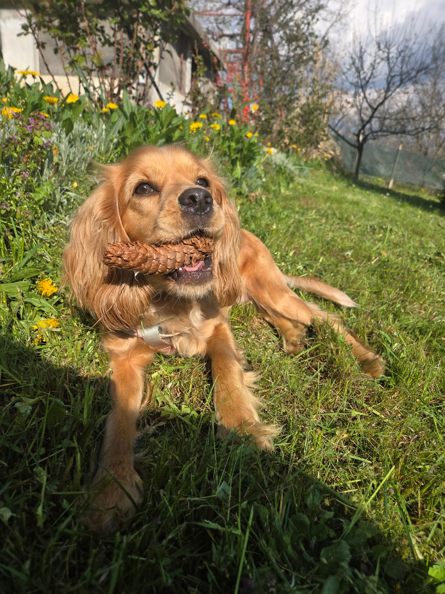 A golden-colored Cocker Spaniel dog is lying on its back in a grassy yard. The dog is holding a pine cone in its mouth. The grass has scattered yellow flowers and other plants. In the background, ther…read more