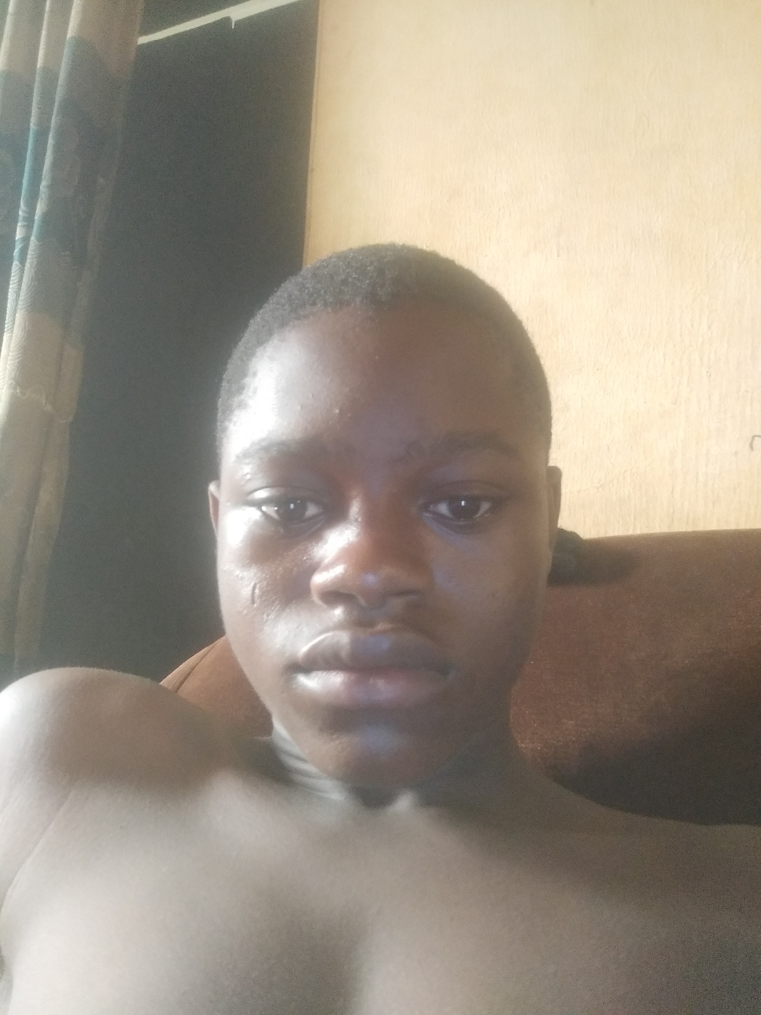 The image shows a close-up, head-and-shoulders shot of a dark-skinned person with short hair. The person appears to be in an indoor setting. The background includes a curtain on the left and a wall on…read more