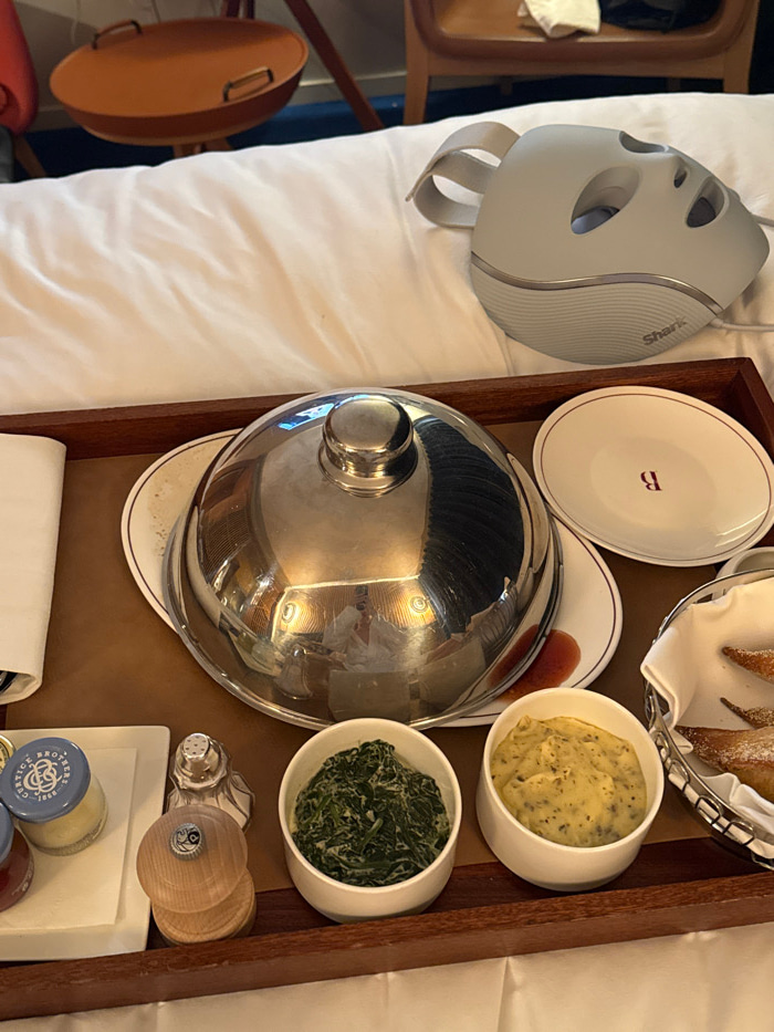 A room service meal on a wooden tray rests on white bedding in a room located in Unknown, Unknown. The tray features a large white plate covered by a silver domed cloche, and an oval white plate with…read more
