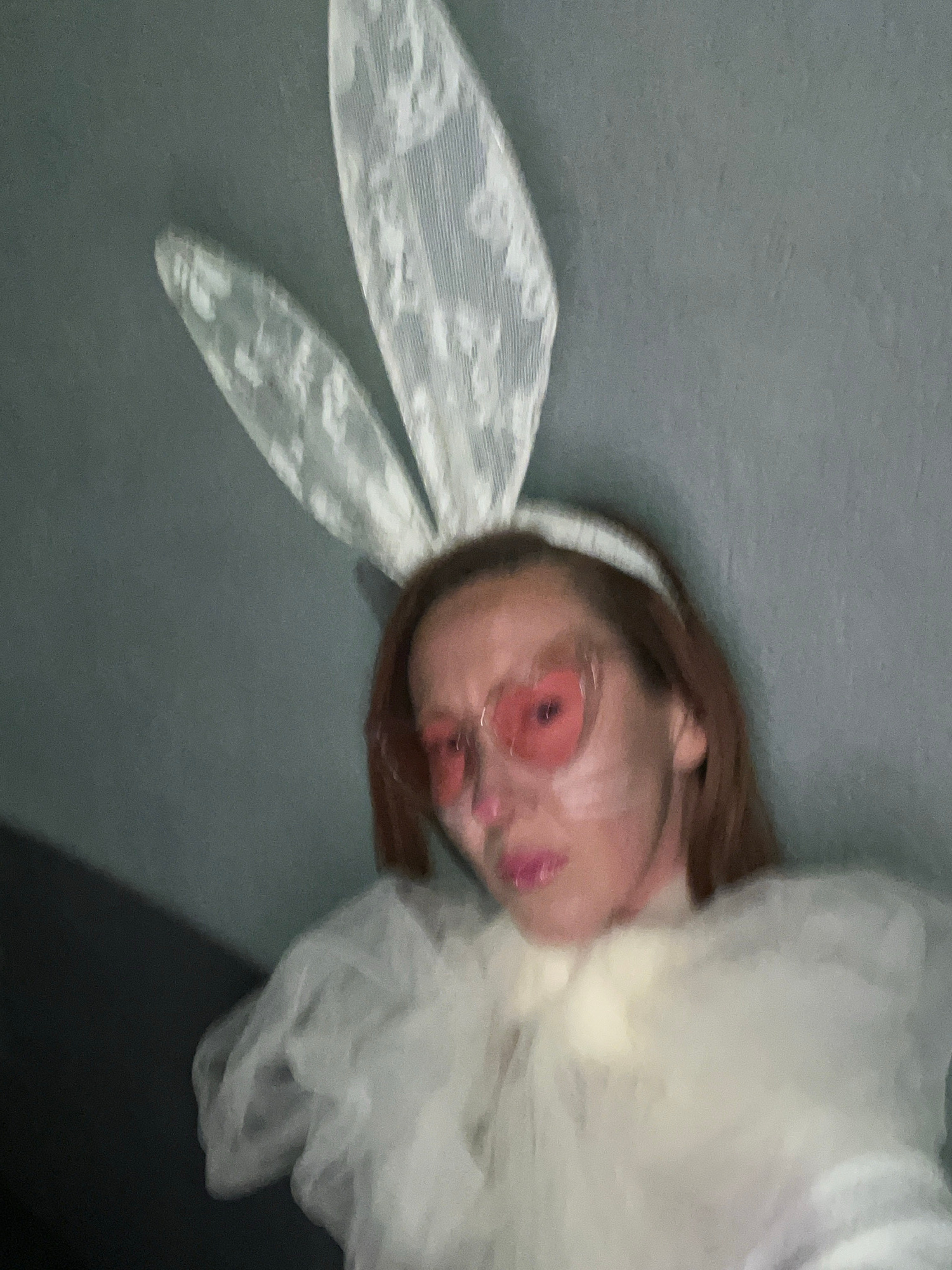 A blurry, tilted close-up image shows a person wearing lace bunny ears and what appears to be a white tulle dress or fabric. The person's face is visible, featuring red-tinted glasses and pink lipstic…read more