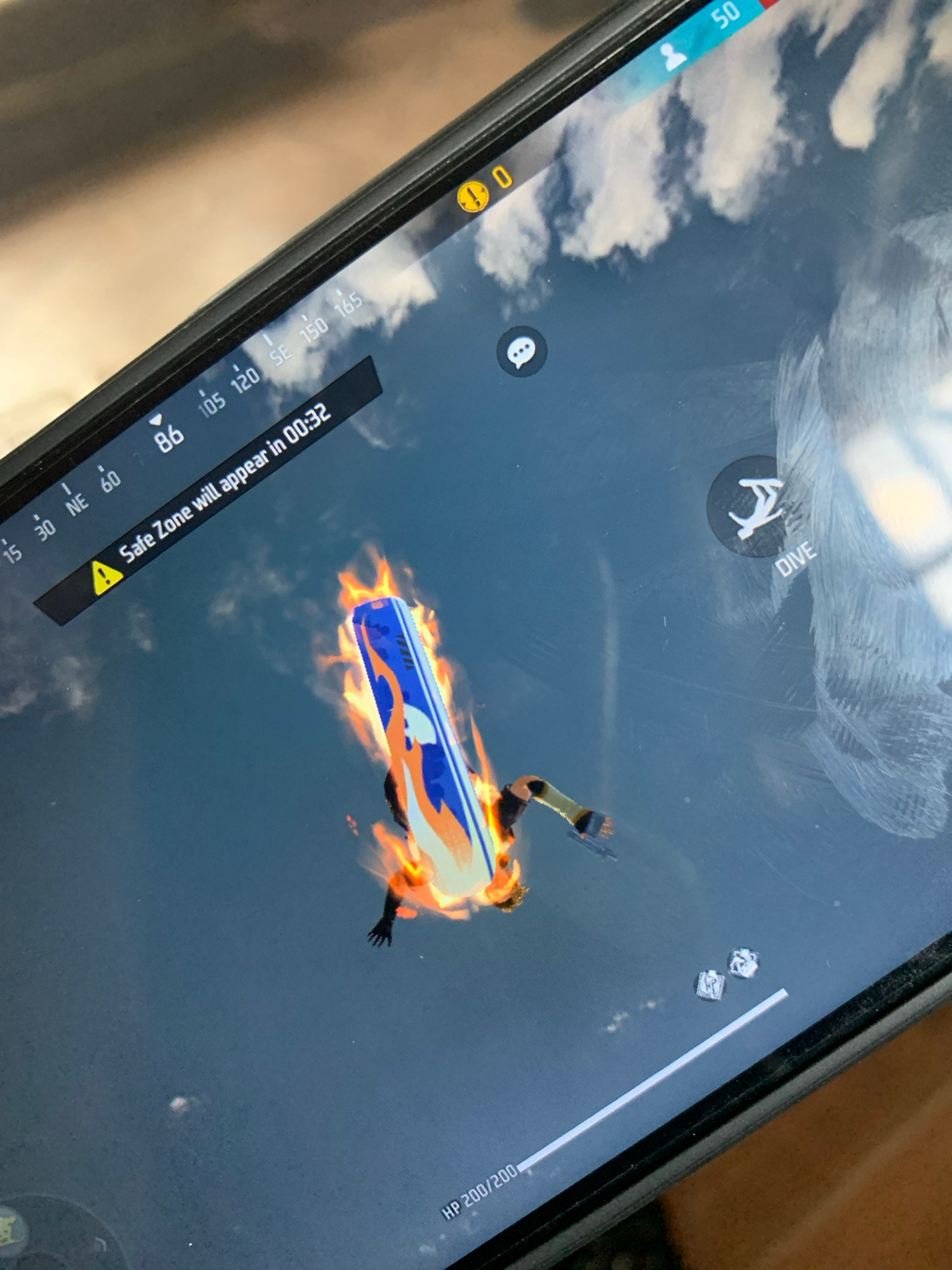 A close-up photograph shows a cell phone displaying a scene from the video game Free Fire. A character is depicted riding a surfboard-like object engulfed in flames. The background shows a cloudy sky.…read more
