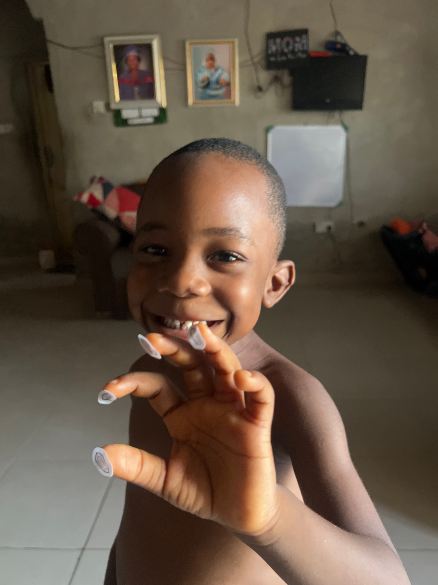 A young, dark-skinned child smiles at the camera, holding their hand up to show fingernails that are adorned with cartoon gem stickers. The background is a dimly lit indoor space, possibly a bedroom,…read more