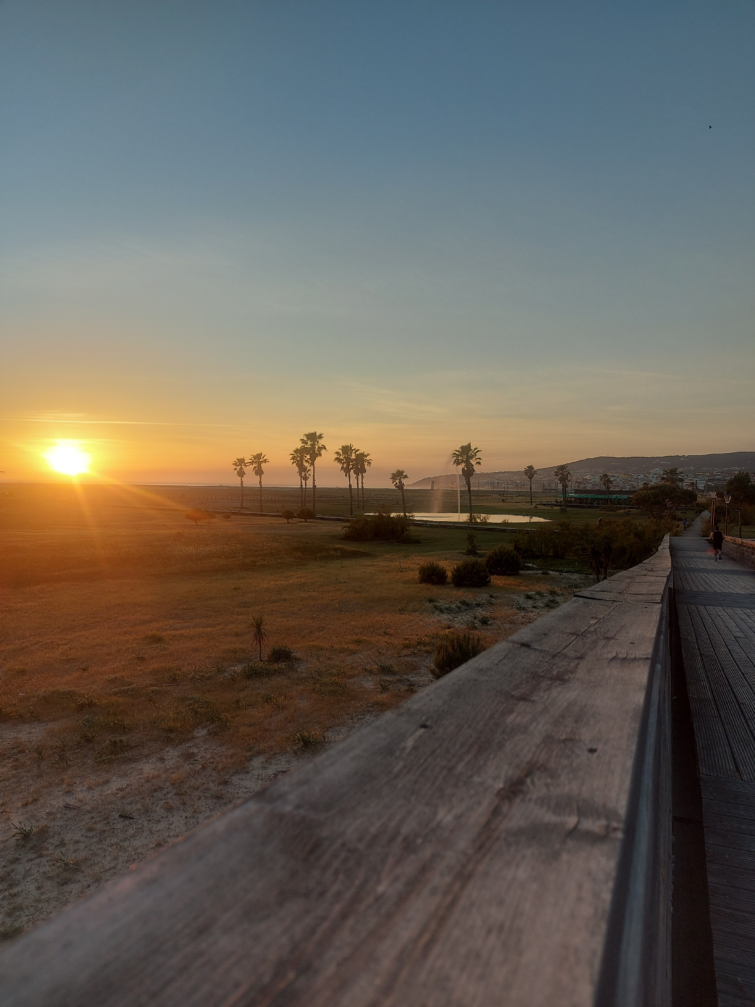 Here is a description of the image: The image shows a view of the beach at sunset in Figueira da Foz, Portugal. The sky transitions from a light blue to a bright yellow-orange as the sun sets on the…read more