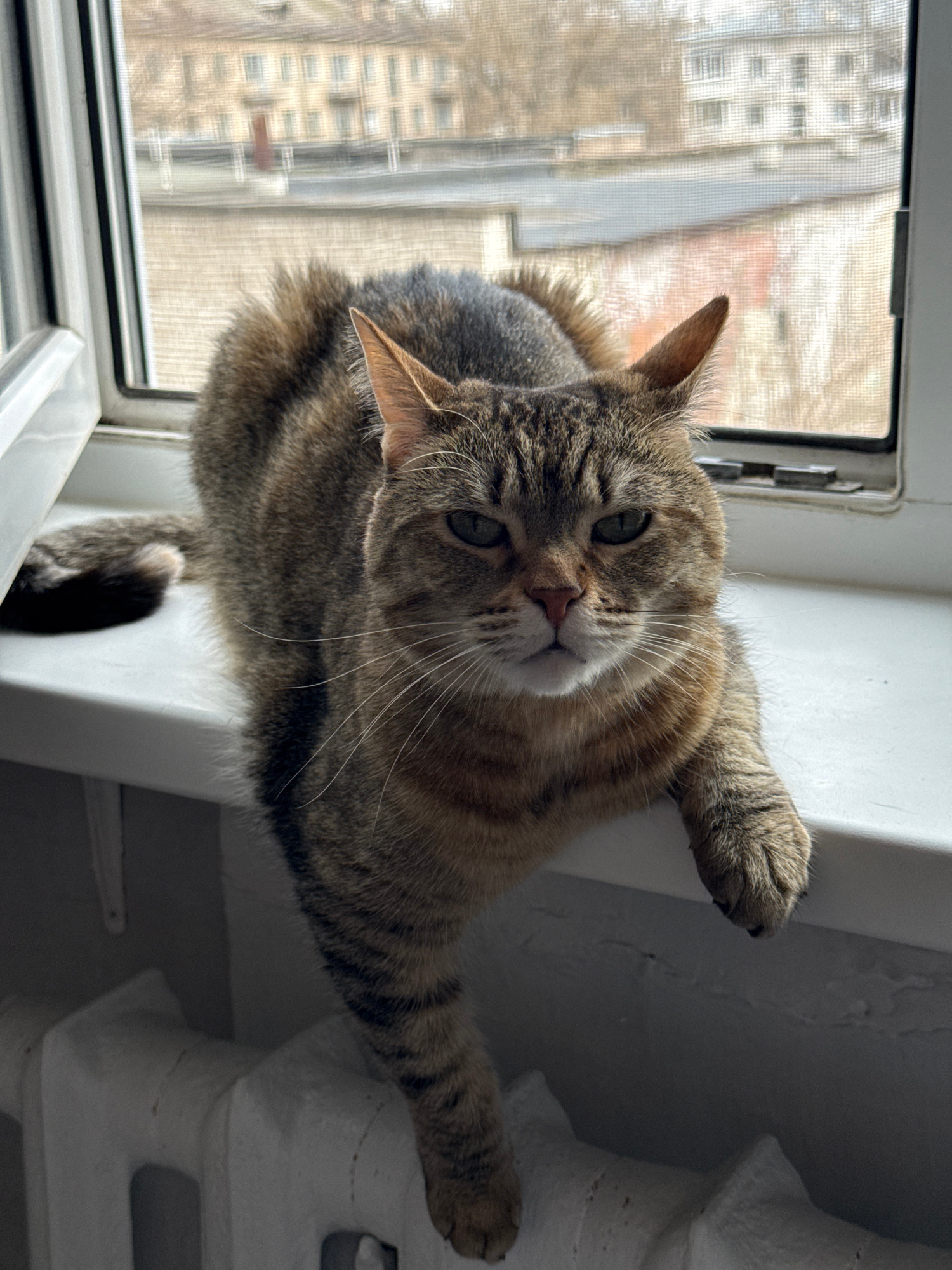 A domestic short-haired tabby cat is captured from a high-angle perspective, lying on its back or side on a white window sill. The cat, with its distinctive brown, black, and grey striped fur, gazes d…read more