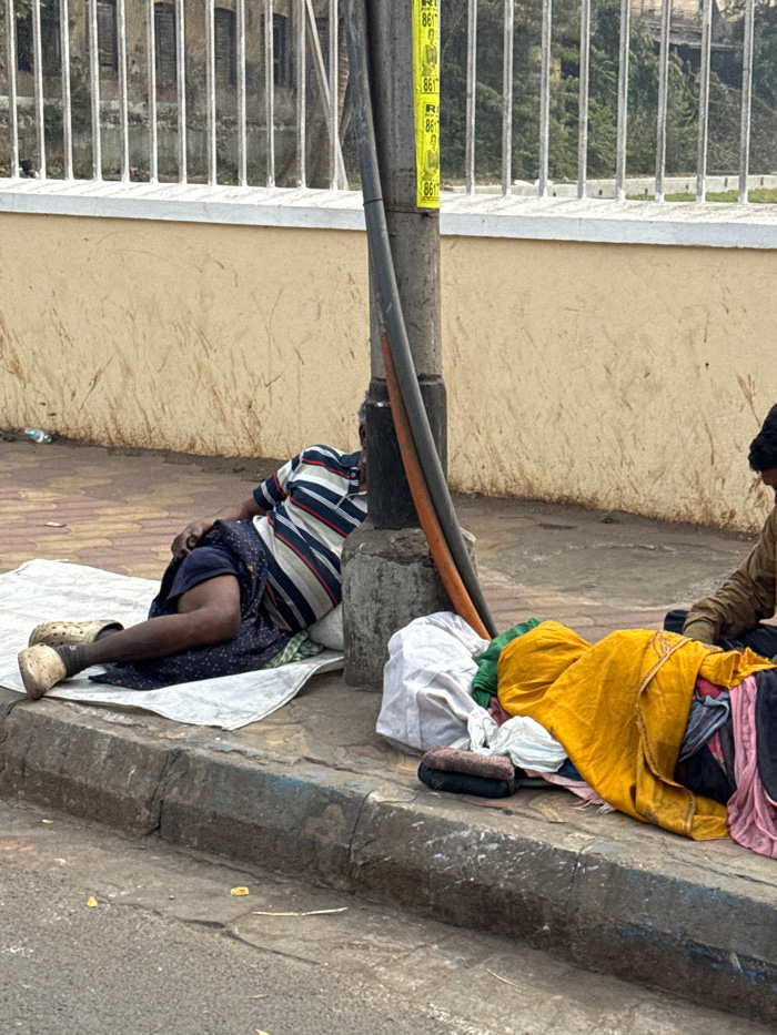 A person wearing a striped shirt and dark bottoms sits on a white cloth near a curb, resting against a utility pole. Behind them, a collection of clothing and personal belongings are piled. The settin…read more