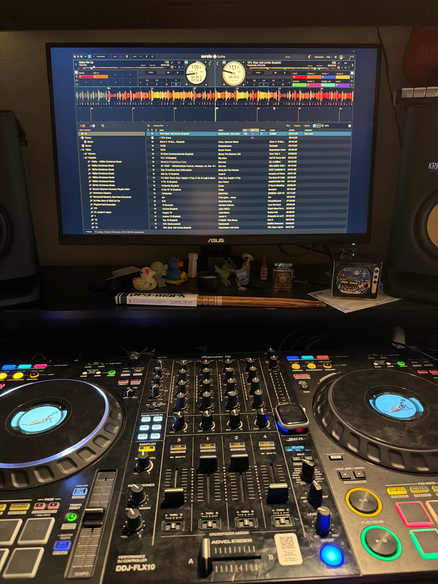The image captures an indoor DJ setup from a high-angle perspective, showing a computer monitor, a DJ controller, and a studio monitor. The scene is illuminated by artificial light, suggesting an evenβ¦read more