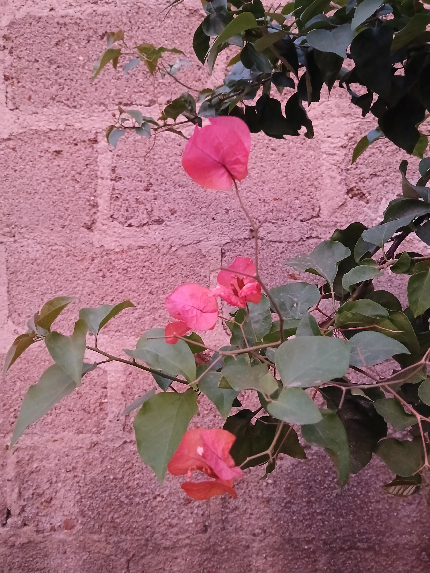 A bougainvillea vine with pink and red flowers and green leaves hangs against a light pink textured wall. The image may be taken in Jos, Nigeria but lacks any specific details that would confirm the lā¦read more