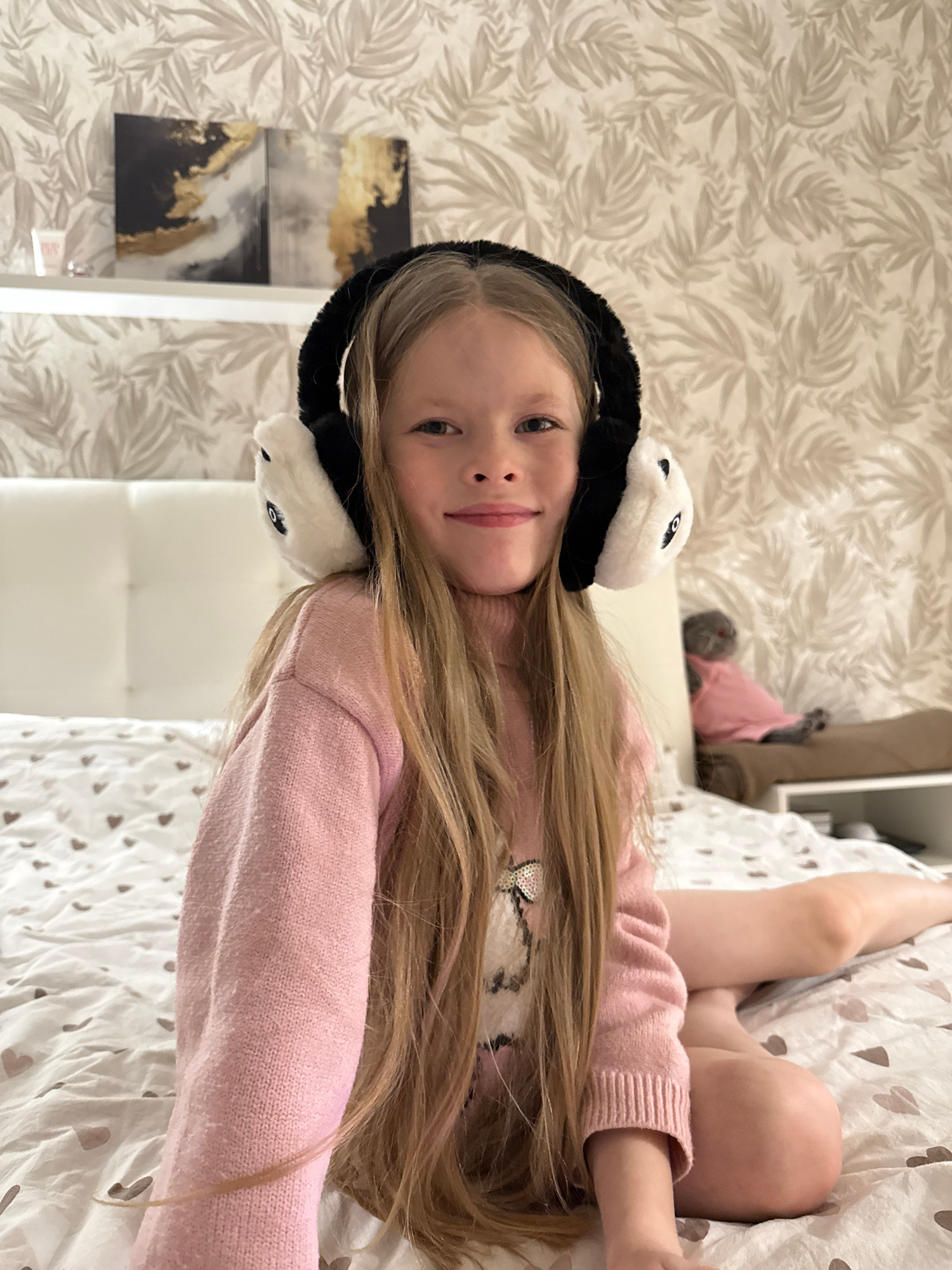 A young girl with long blonde hair, wearing a pink sweater and panda earmuffs, is lying on a bed with a heart-patterned white comforter. The background shows a wall with leaf-patterned wallpaper. A pi…read more