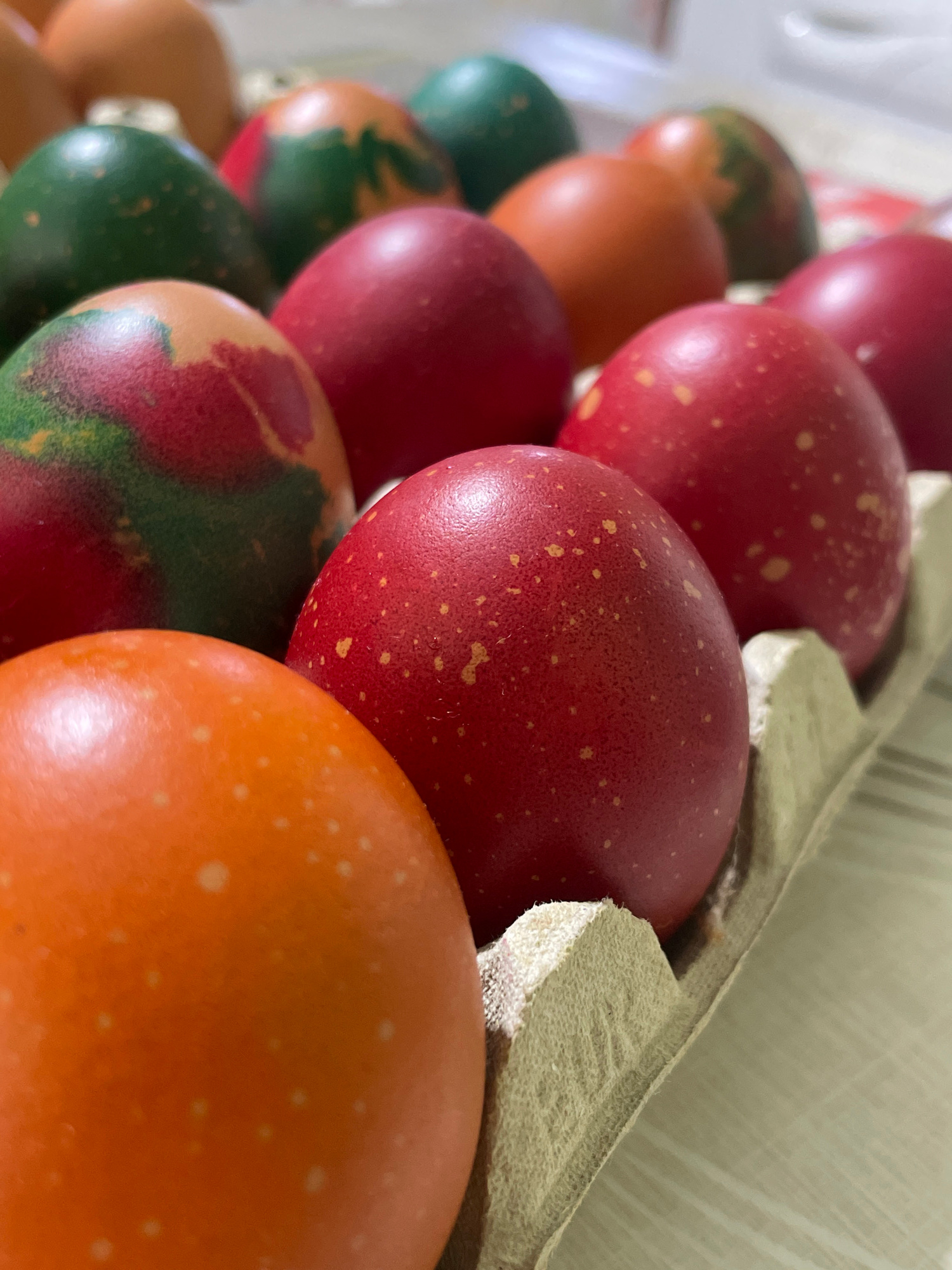 The image shows a close-up of several dyed Easter eggs in a cardboard egg carton. The eggs are various colors, including red, orange, green, and brown, some speckled with white or gold flecks. The egg…read more