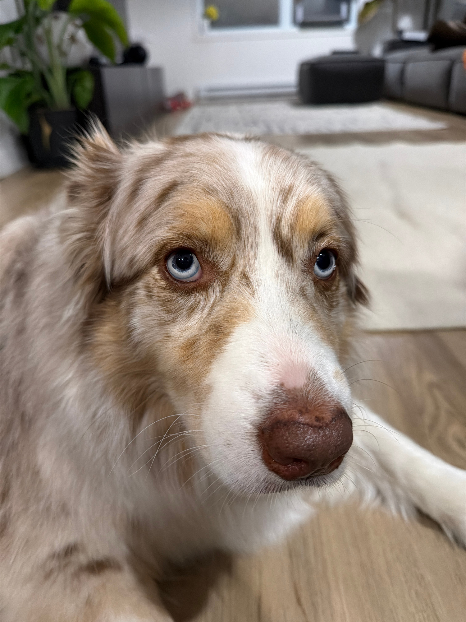 A close-up, slightly angled view shows a dog with blue eyes, a pink and brown nose, and light brown and white fur. The dog is lying on what appears to be a wooden floor. In the blurred background on t…read more