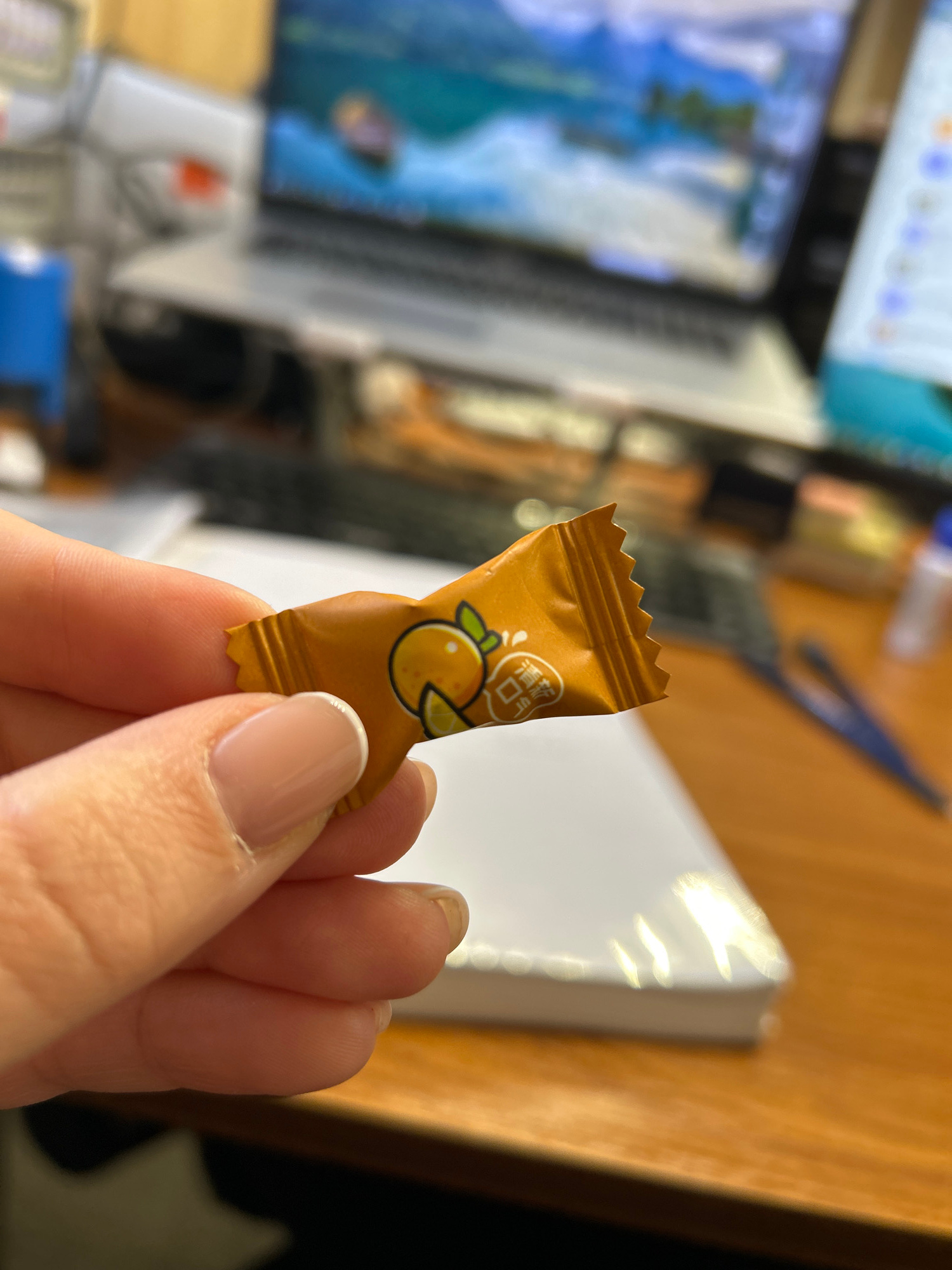 A person's hand holds an opened piece of orange candy, adorned with a drawing of an orange and Chinese lettering. The candy wrapper is a light brown color. The hand has well-manicured nails. The backg…read more