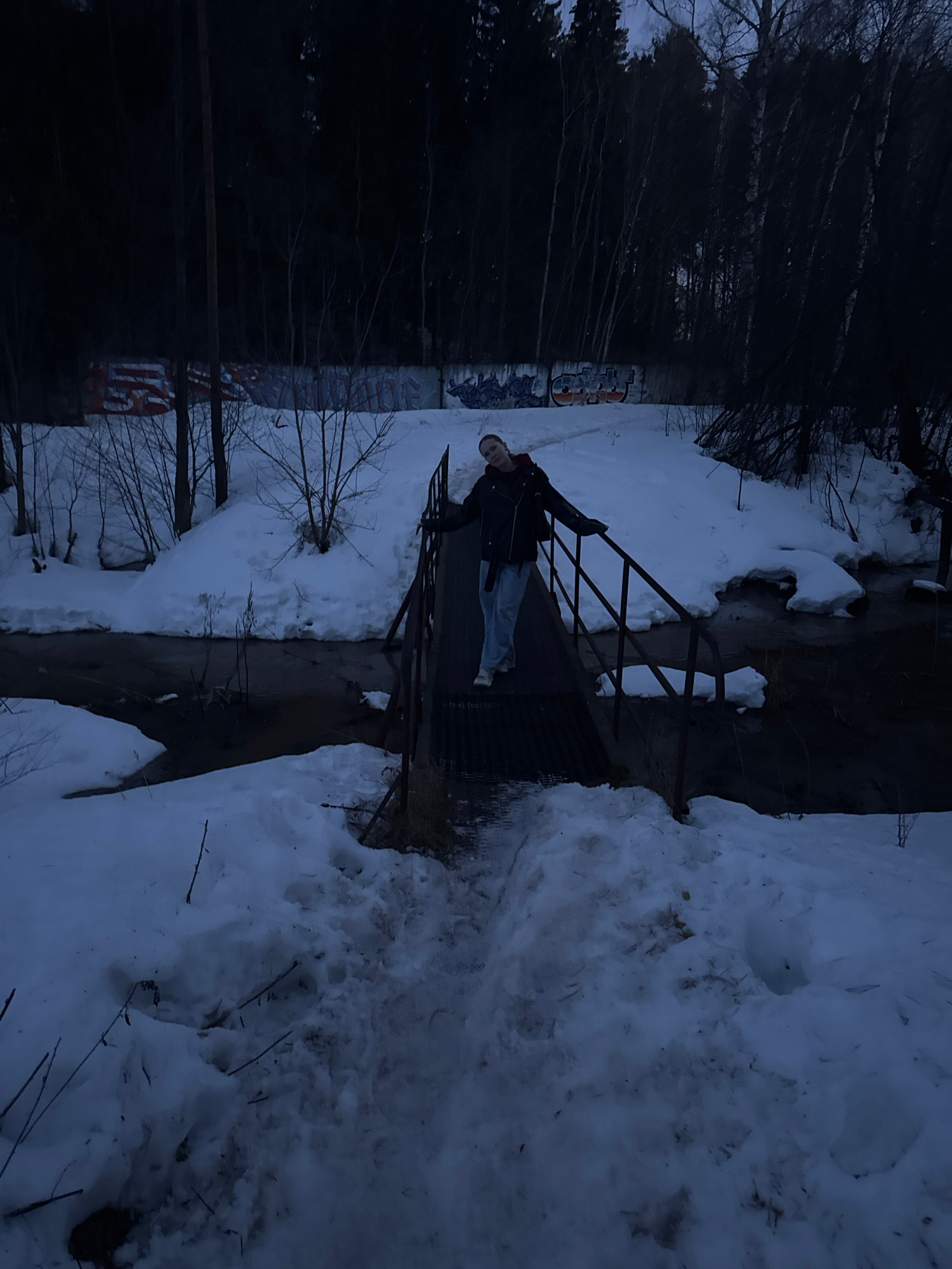 The image depicts a person standing on a metal grate bridge over a narrow stream or ditch. The location is snowy, suggesting it is winter or early spring. Trees are visible in the background. The indiβ¦read more