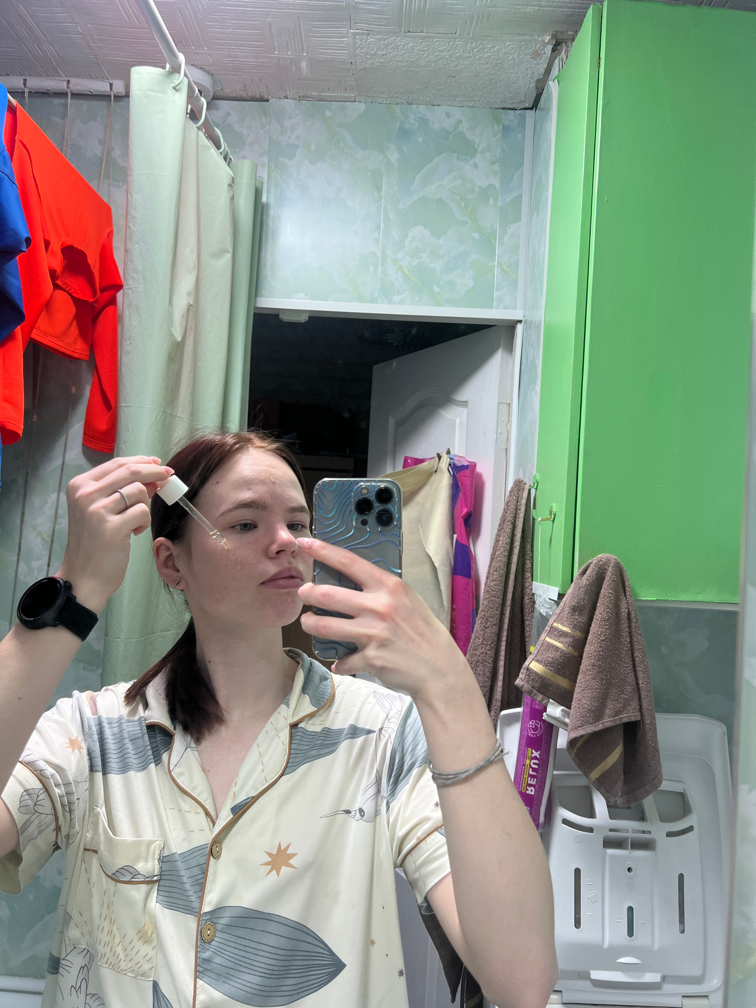 A female is taking a selfie in a bathroom. She is holding a dropper with a liquid product near her face. She is wearing pajamas and a smartwatch. The bathroom has green cabinets, white tiled walls, an…read more