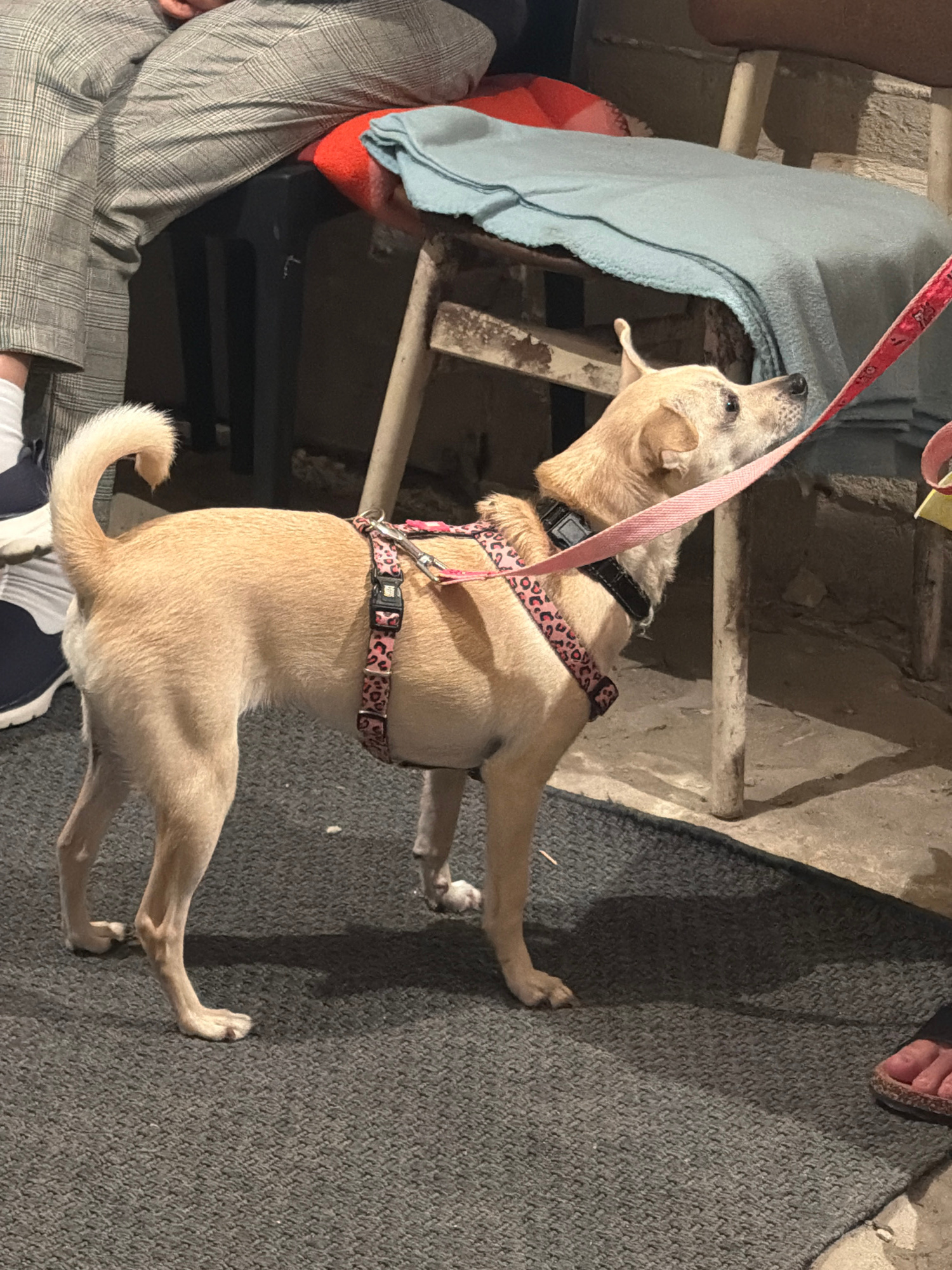 A medium-sized tan dog wearing a pink-leopard-print harness and black collar is standing on a dark gray carpet. The dog is looking upwards, its leash held by a person whose hand is visible above the d…read more