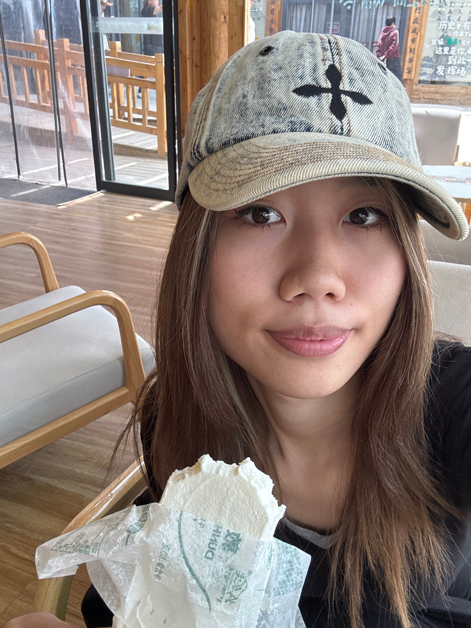 A selfie-style image, rotated 90 degrees clockwise, features a young person looking directly at the camera with a gentle smile. She has long, straight brown hair and wears a light-colored denim baseba…read more