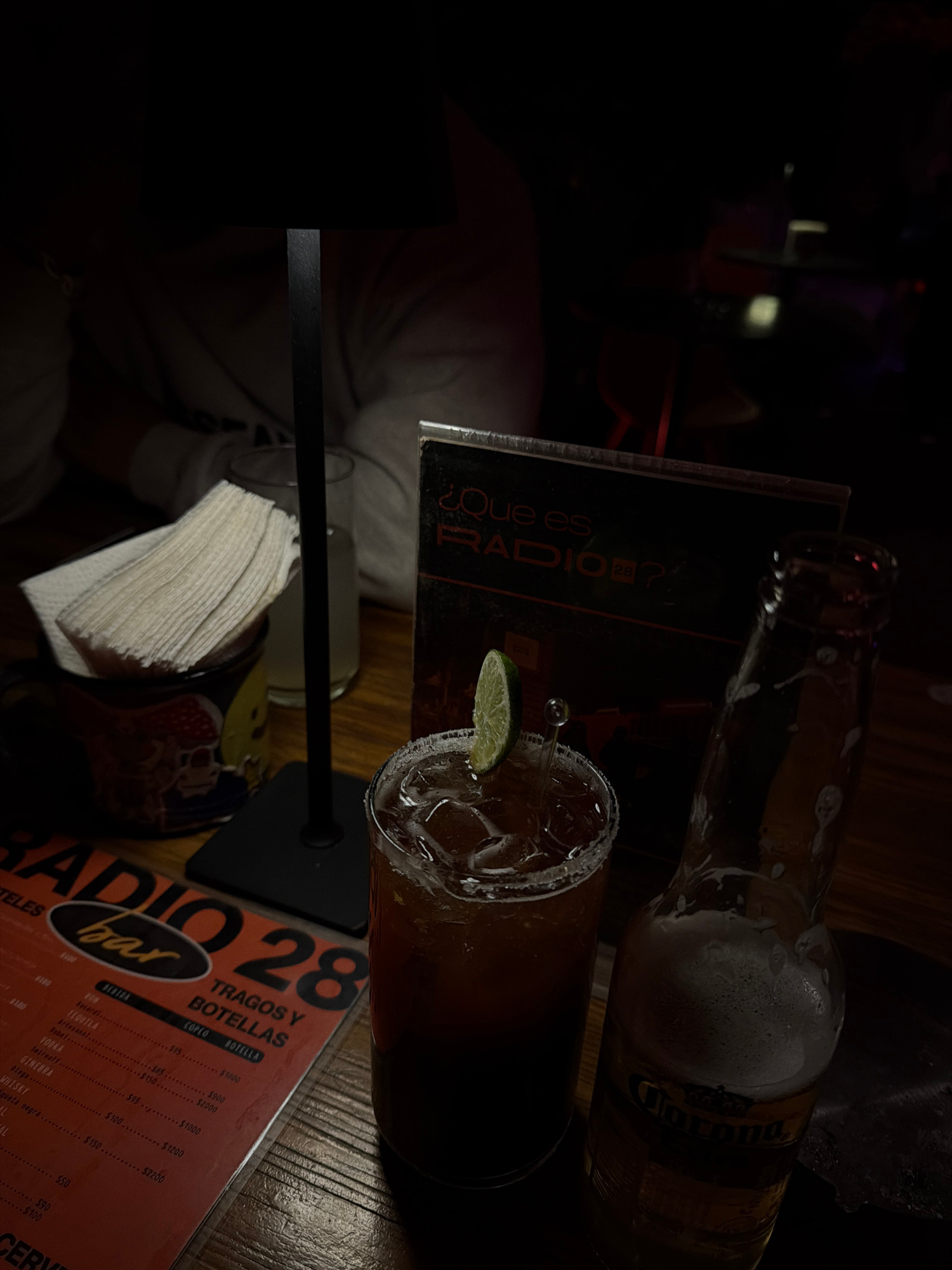 The image captures a table at Radio Bar 28 in San Andrés Cholula, Mexico. A partially consumed bottle of Corona beer rests near a glass of margarita, garnished with a lime wedge. A folded menu from Ra…read more