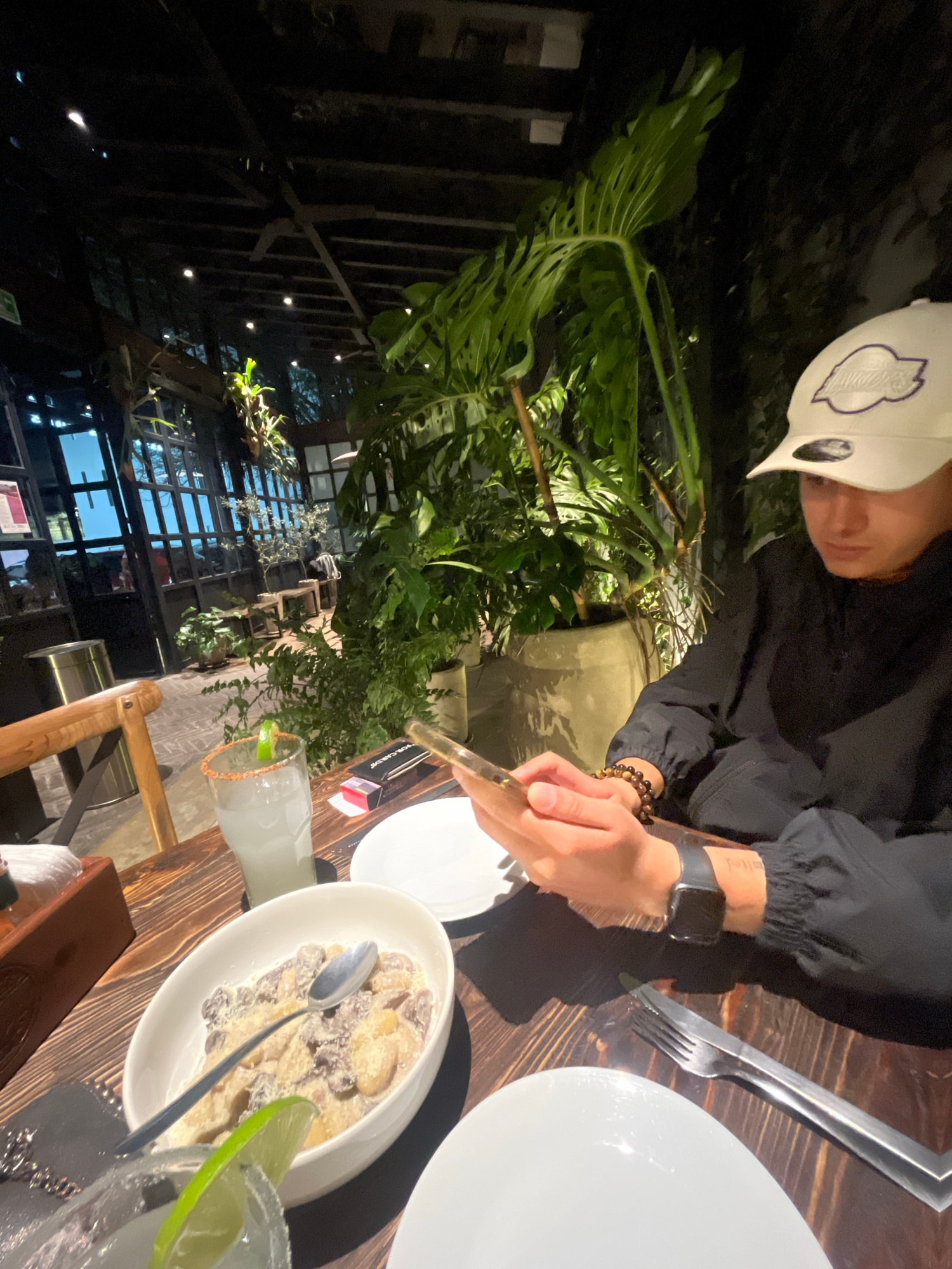 A person wearing a black jacket and a white baseball cap is seated at a wooden table in what appears to be an open-air or indoor-outdoor setting in San Andrés Cholula, Mexico. The person holds a smart…read more
