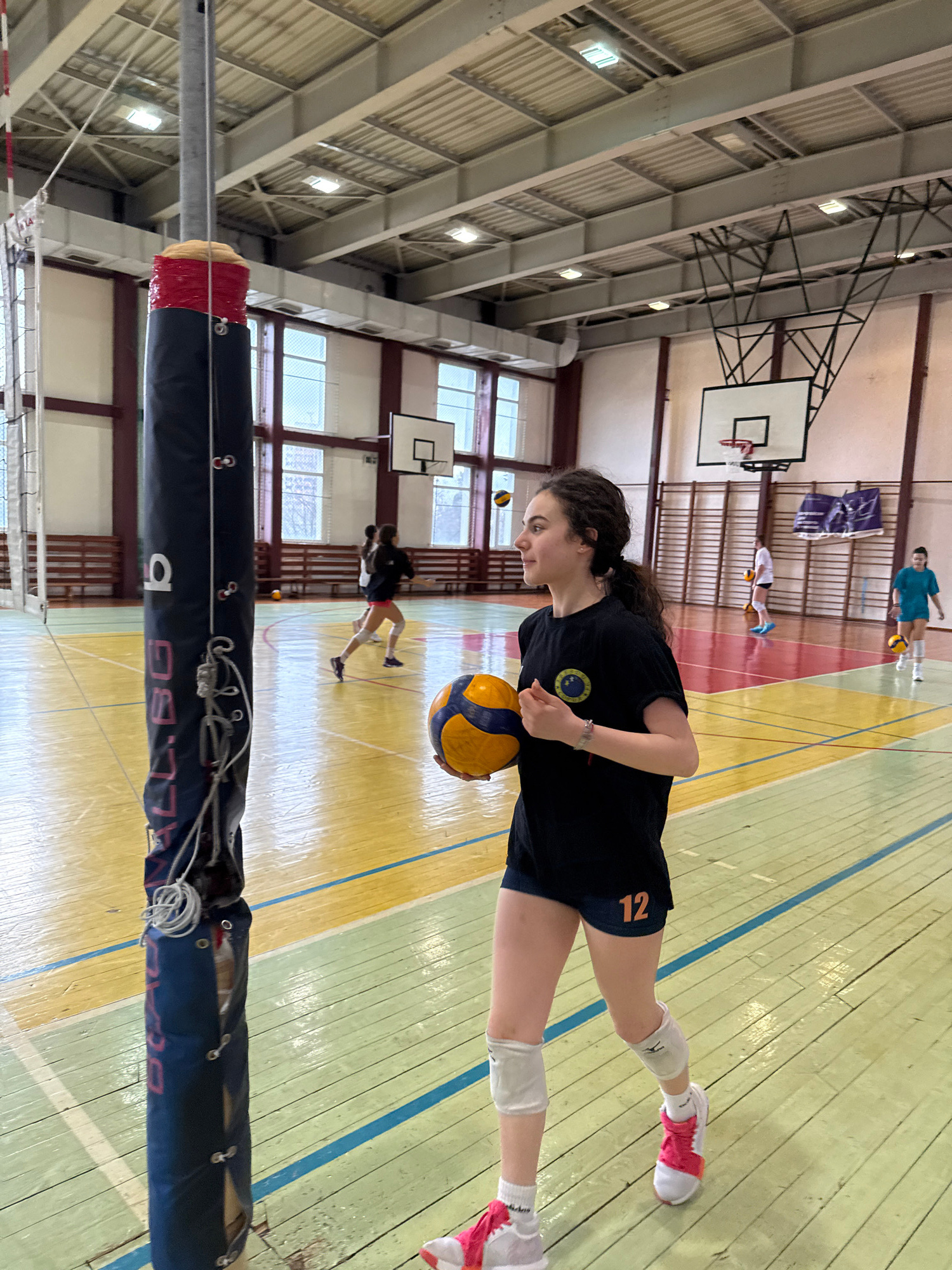 A young woman in a black t-shirt and shorts, knee pads, and pink-accented sneakers stands on a multi-colored gymnasium floor with a volleyball in her hands. The number "12" is visible on her shorts. A…read more