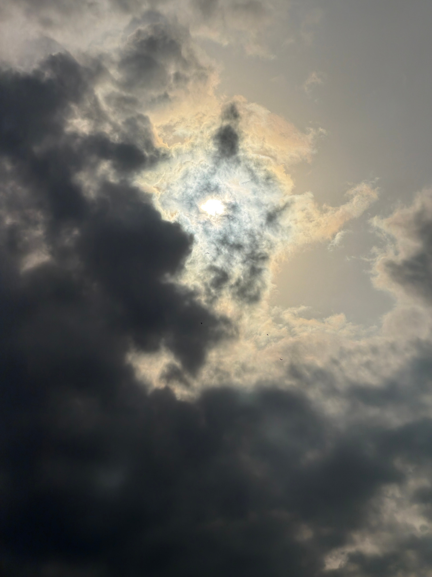 The image shows a cloudy sky with a break in the clouds allowing sunlight to partially shine through. Some small dark objects, possibly birds, are visible in the break in the clouds. The location, Chaβ¦read more