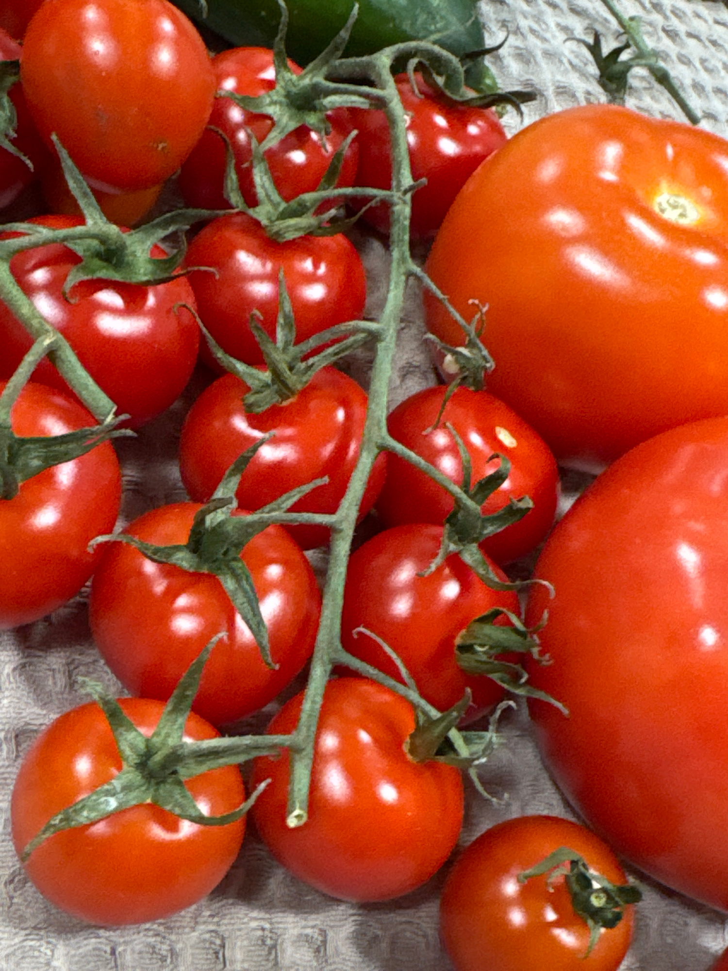 The image depicts a collection of fresh, red tomatoes of varying sizes. Several small tomatoes are still attached to a green vine, while larger, individual tomatoes are also present. The arrangement s…read more