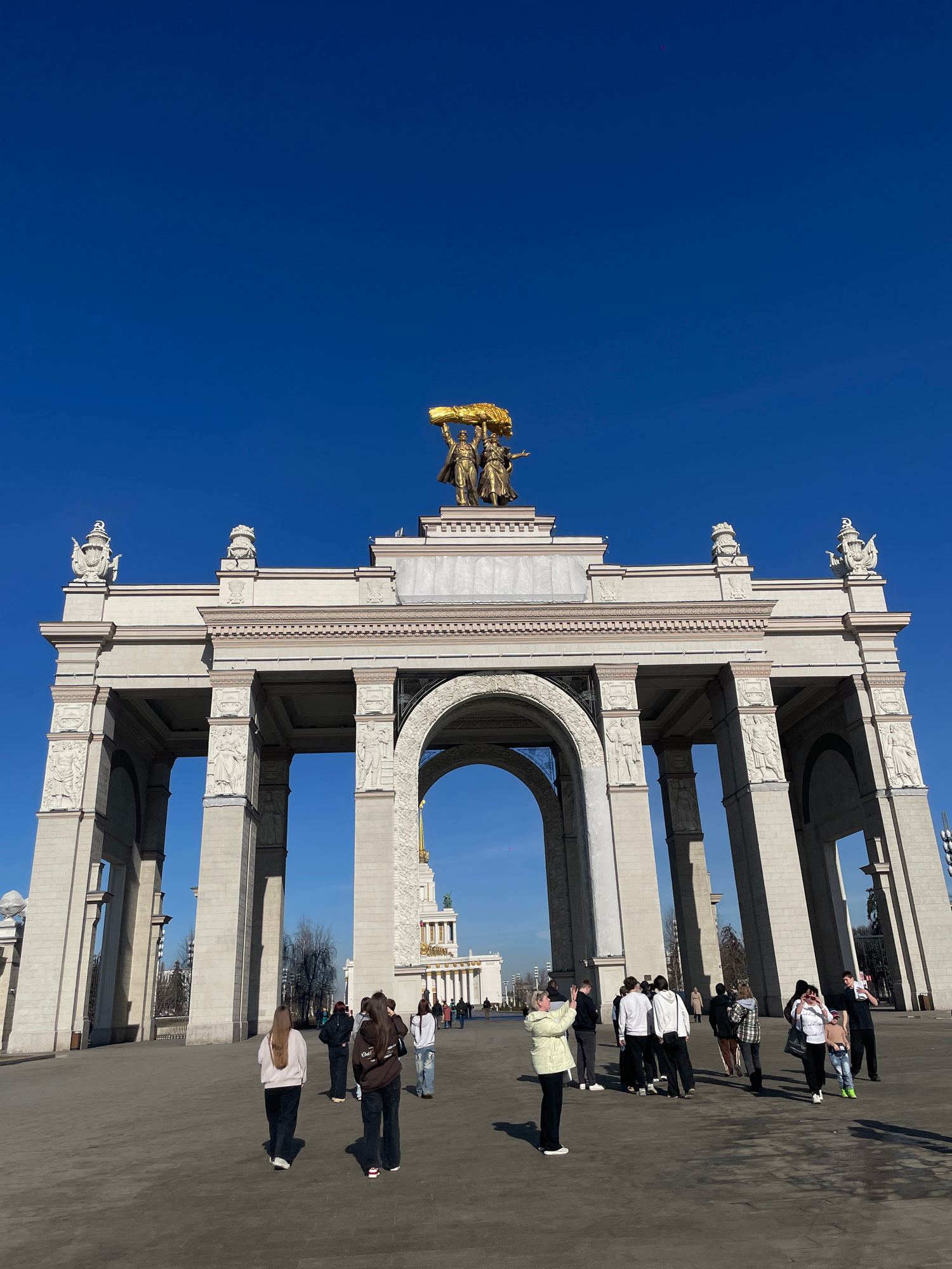 The image shows a monumental archway under a clear, bright blue sky. The archway is constructed of light-colored stone and features detailed relief carvings. Atop the archway stands a golden statue of…read more